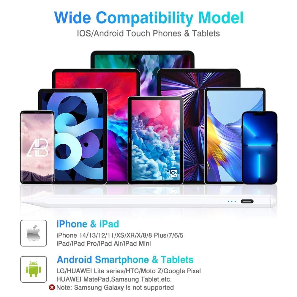 Precise and Versatile Digital Interaction: Our stylus pen provides accurate and effortless interaction with your touch screen device. Enjoy comfortable writing and drawing without the worry of unintended marks or smudges. Convenient Magnetic Design: The stylus pencil features a magnetic design that securely attaches to the side of your tablet. No more worrying about it rolling off surfaces or getting misplaced. It’s always within reach when you need it. Effortless Touch Switch: Simply double-tap the top of the pen to turn it on or off. No complicated setup or Bluetooth connection required, ensuring instant and hassle-free access to your creative projects.Auto Sleep for Extended Battery Life: To conserve battery, the stylus pen automatically enters sleep mode after 10 minutes of inactivity. This ensures that you get the most out of the long-lasting 130mAh lithium battery. Fast Charging via Type-C Port: When it’s time to recharge, simply use the Type-C port for a quick and convenient charging experience. In just 45 min, your stylus pen will be ready for another 8-10 hours of use. Broad Compatibility: Our stylus pen is compatible with iOS, Android, and Windows smartphones and tablets, offering versatility and seamless performance across a range of devices. The power display feature allows you to monitor the battery level,.