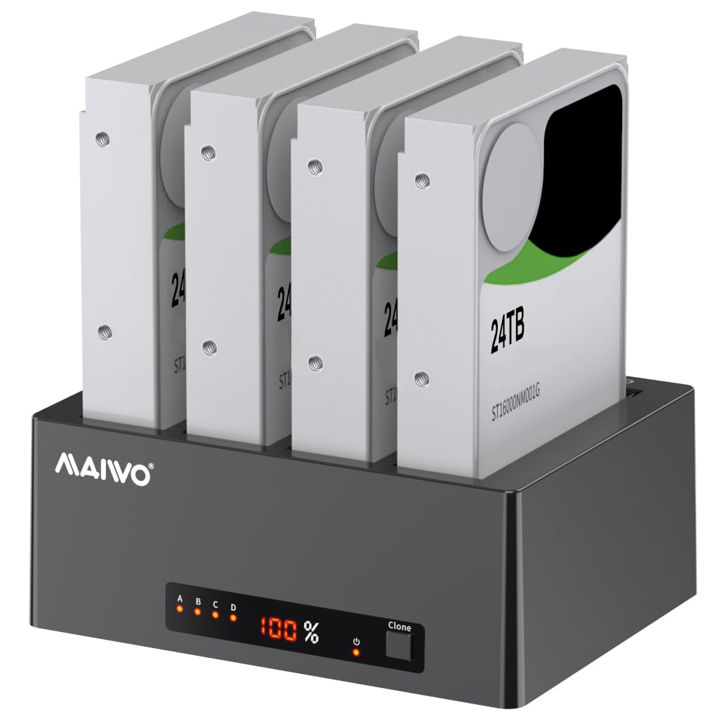 【Compatibility】This 4 bay SATA hard drive duplicator supports both 2.5 3.5 inch SATA HDD and SSD, each port supports 22TB drive, 96TB capacity in total, a perfect solution for backup and processing IT data, batch processing data, formatting, file transfers, data recovery etc 【Offline Clone】This external hdd bay supports offline cloning data without connecting to computer, backup source HDD to target HDD automatically, no drivers needed, tool free, easy installation. LED light indicators for clone progress: 25%-50%-75%-100% 【Super Speed】It has two transfer ports – USB 3.0 and eSATA, this external hard drive to usb 3.0 adapter reader can provide 5Gbps bandwidth, back-up files and centralize storage for convenient access, backwards compatible with USB2.0 and USB1.1 (Please note that USB 3.0 Type-B and eSATA can not use at the same time.) 【Independent Power】Highly efficient 12V 7A power supply offers a stable and reliable service environment for this hard drive dock 【Wide Application】This external hard drive cloner is compatible with Window98/Me/2000/XP/Vista/7/8/10, MAC OS, Linux. And works with Laptop/Desktop/TV/Phone/Router/PS4/PS5, etc