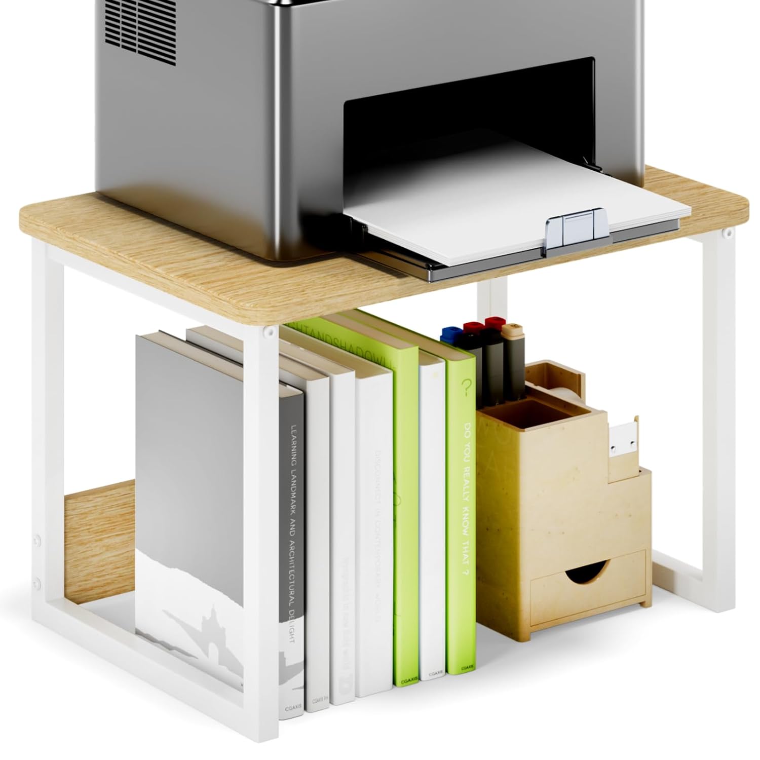 【Sturdy & Durable】This desktop printer stand is made of high-quality board + strong steel frame + bottom metal support bar. It can easily hold up to 100lbs and strong enough to be stacked for use.