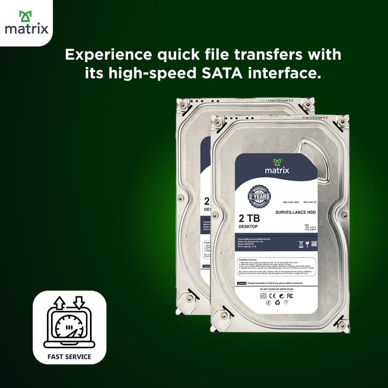 Discover the perfect solution for all your storage needs with the Matrix 2TB 3.5 Inch Internal SATA Hard Disk Drive. This high-capacity HDD offers an impressive 2 terabytes of storage space, allowing you to securely store a vast amount of data, from multimedia files like movies and music to important software applications and operating systems.Renewed and Designed and upcycled for desktops and surveillance systems, this versatile hard drive is built with durability and performance in mind. The Matrix HDD spins at a high speed of 7200 RPM, delivering fast read and write speeds of up to 220 MBps and 210 MBps, respectively. This ensures smooth, lag-free performance, whether gaming, editing videos, or simply backing up your files. The drive’s 3.5-inch form factor makes it compatible with most desktop computers, providing a reliable and cost-effective solution for enhancing your system’s storage capabilities. In addition to its impressive performance, the Matrix 2TB HDD is designed to be dependable. It features a mean time between failures (MTBF) of up to 1.2 million hours, ensuring long-lasting reliability. This hard drive is backed by a 2-year warranty from Matrix, giving you peace of mind and confidence in your purchase. Whether upgrading your desktop’s storage or setting up a new surveillance system, the Matrix 2TB Internal Hard Disk Drive is the ideal choice for professional and personal use. The warranty on all Matrix hard drives is provided solely by Matrix and is not covered by any original equipment manufacturers.