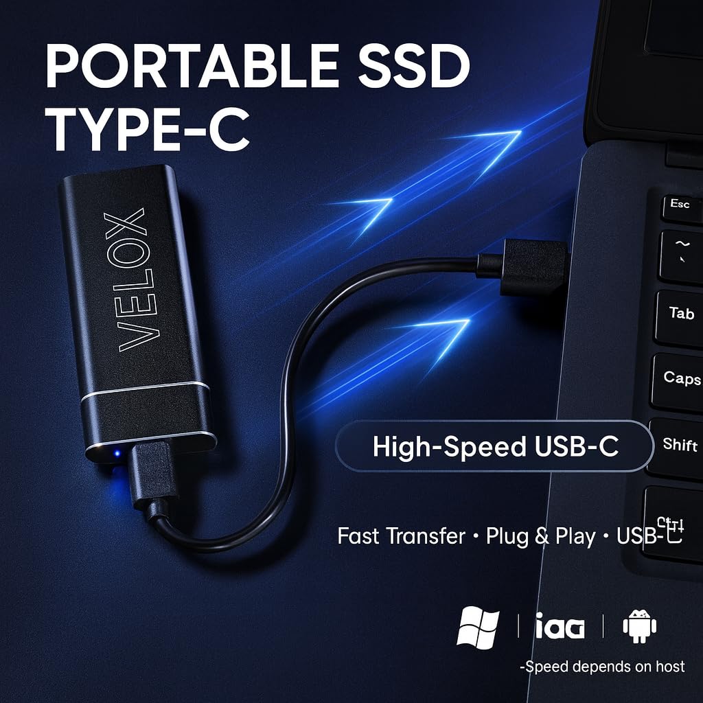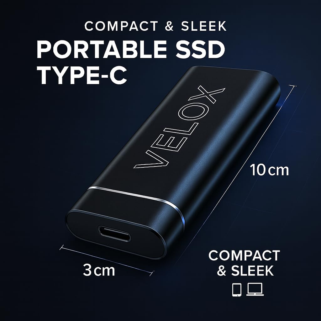 Introducing the VELOX Portable SSD, a premium storage solution that combines speed, durability, and versatility. This sleek drive features USB 3.1 Gen 2 technology, delivering blazing-fast transfer speeds up to 10Gbps for your photos, 4K videos, and large projects. The sophisticated anodised aluminium shell measures just 10cm × 3cm, making it perfectly pocket-sized while providing excellent shock resistance and thermal management. Compatible with multiple platforms, it works seamlessly with laptops, Macs, Android devices, and iPads through its USB-C interface. The package includes both a USB-A 3.1 cable and a Type-C OTG adaptor for maximum connectivity flexibility. Built for professionals, creators, and gamers who demand reliable high-speed storage on the go, this drive offers plug-and-play functionality across devices. The premium build quality is backed by a comprehensive 4-year warranty, ensuring long-term peace of mind. Whether you’re storing important work files, editing media projects, or expanding your gaming library, the VELOX Portable SSD delivers exceptional performance in a sophisticated, travel-ready package.
