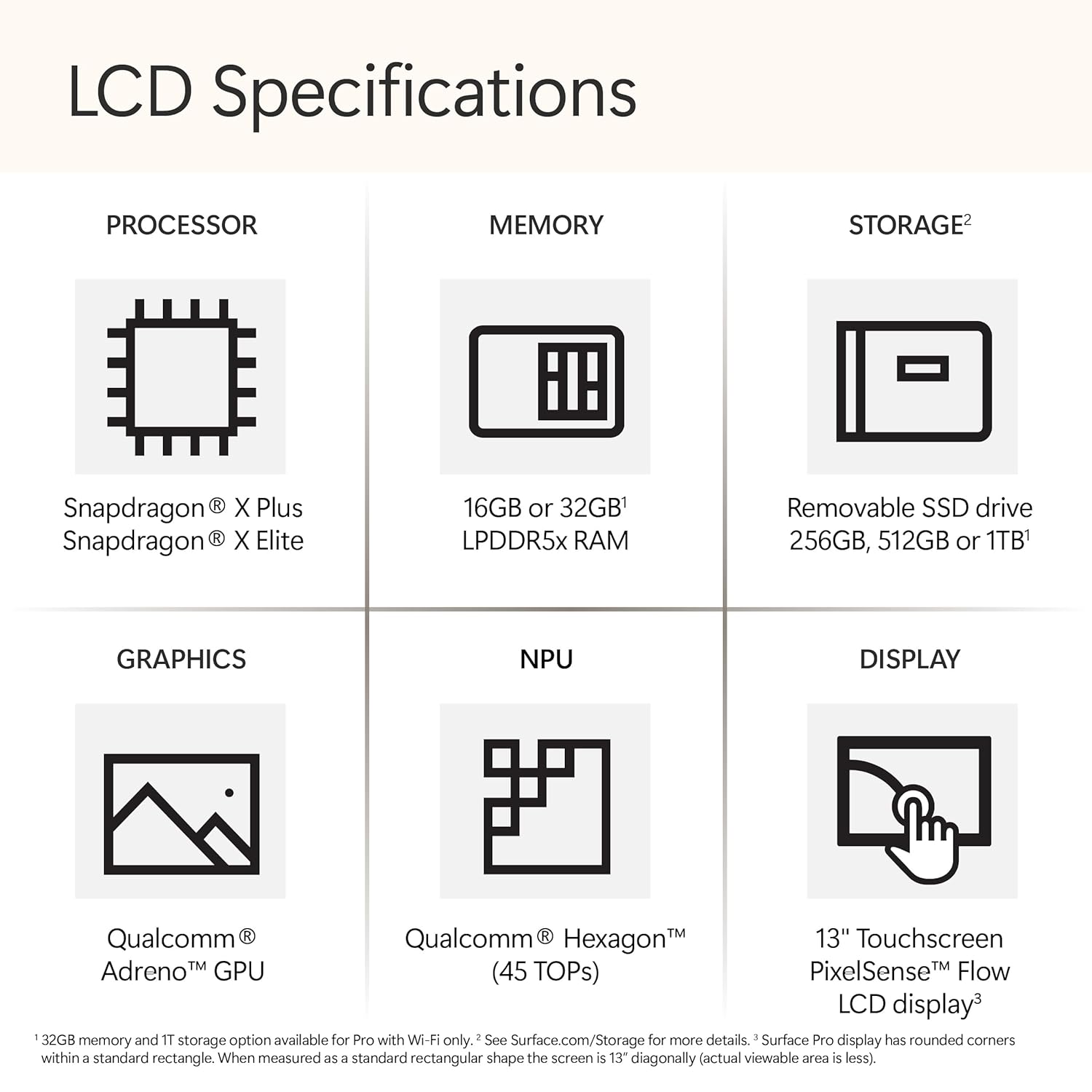 Copilot+ PC: A new era of AI. The fastest, most intelligent Surface ever Most powerful 2-in-1 on the market: Faster than iPad Pro M2. Crazy-fast speeds and next-gen capabilities by a powerful AI accelerator and an all-new processor for ultimate multitasking Unrivalled flexibility: Industry-leading performance in an ultra-flexible design with its iconic 165-degree fluid kickstand Your AI sidekick accelerated: Search for what you need with natural language, whether you saw it, sent it, or saved it across any platform and let Recall find it, instantly Stay connected anywhere: Ultra-fast speeds anywhere with wireless Wi-Fi 7 and optional 5G connections All day battery life: 14 hours of battery life and less down-time charging, supports fast charging with minimum 65W PSU via Surface Connect or USB-C AI-enhanced Studio Camera: HD front and rear cameras with AI-enhanced features for perfect lighting and clear sound Stunning Colors: Black and Platinum and matching keyboards in premium Alcantara fabric (sold separately) Designed for sustainability: The most sustainable 2-in-1 device available with recycled aluminum and more replaceable components