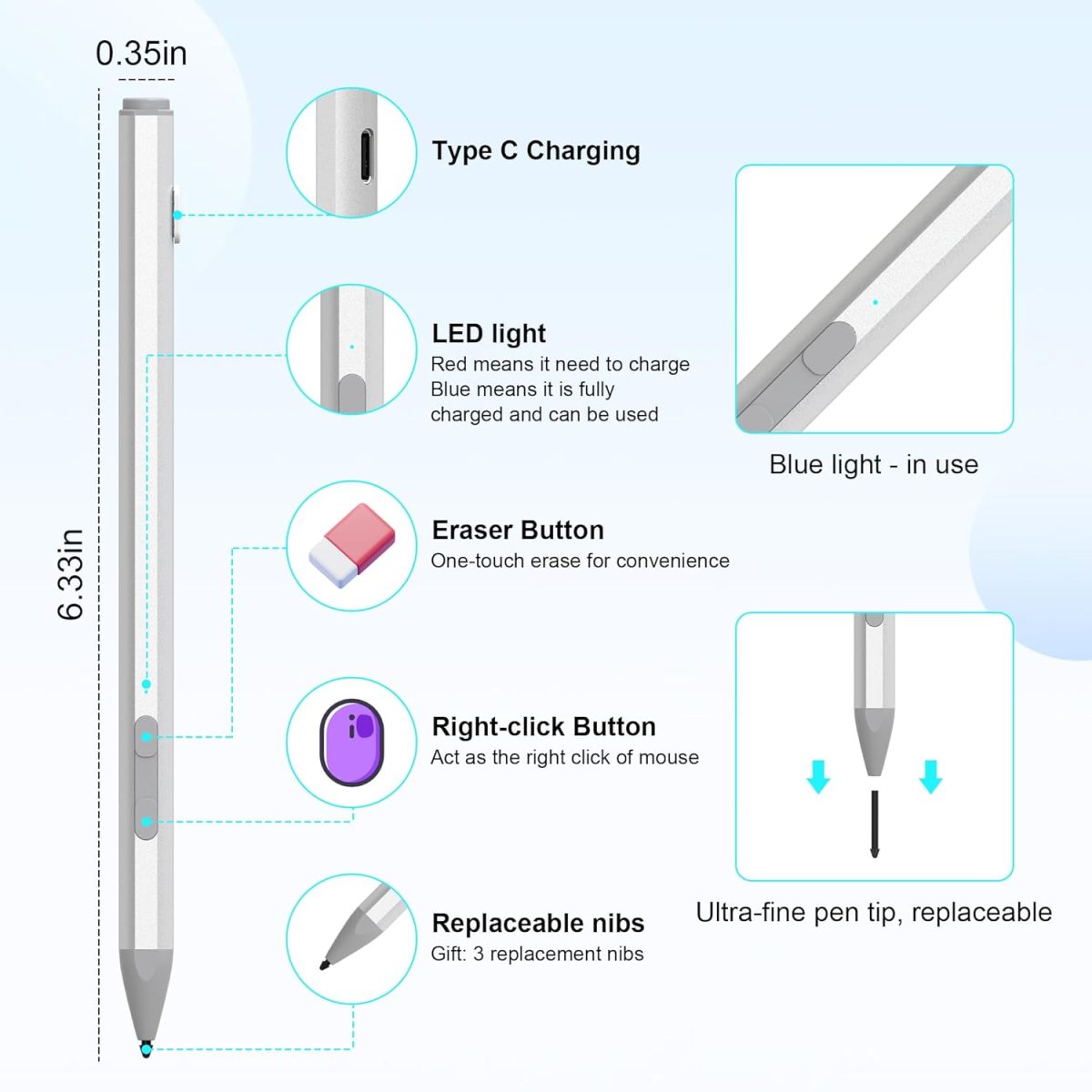 Eraser and Right-click Functions & 3 Replaceable Pen Tip: The Surface Pen comes with eraser and right-click functions, the lower key is the right mouse button, and the upper key is the eraser, which helps you to improve your work efficiency. Just press any button to wake up the surface pen and start writing, no Bluetooth or drivers required. Easy to Replace Tip:3 extra nibs for easy replacement at any time.