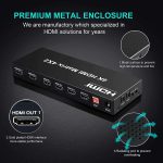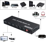 HDMI switch 4×1 and Audio Extractor, features 4 HDMI inputs and 1 HDMI output, with the remote control to choose which HDMI in or switch it with the button on the panel