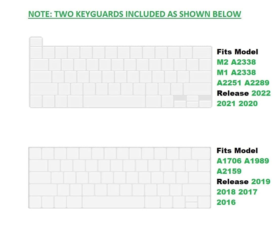 Perfect Fit: The case is designed only to be compatible with MacBook Pro 13 inch with Touch Bar, Touch ID — Model: M2 A2338 / M1 A2338 / A2289 / A2251 / A1706 / A2159 / A1989 and Model A1708 without Touch Bar — Release 2023 – 2016 –MNEP3LL/A, MNEQ3LL/A, MNEH3LL/A, MNEJ3LL/A, MYD92LL/A, MYDC2LL/A, MYD82LL/A, MYDA2LL/A, MUHN2LL/A, MUHQ2LL/A, MUHP2LL/A, MUHR2LL/A, MV962LL/A, MV992LL/A, MV972LL/A, MV9A2LL/A, MR9Q2LL/A, MR9R2LL/A, MPXV2LL/A, MPXX2LL/A, MPXW2LL/A, MPXY2LL/A, MPXQ2LL/A, MPXR2LL/A, MPXT2LL/A, MPXU2LL/A, MLL42LL/A, MLH12LL/A, MLVP2LL/A, MNQF2LL/A, MNQG2LL/A, MXK32LL/A, MXK62LL/A, MXK52LL/A, MXK72LL/A, MWP42LL/A, MWP72LL/A, MWP52LL/A, MWP82LL/A. Package Includes: 1 x Top Case, 1 x Bottom Case, 2 x Keyboard Cover, 1 x Set of Dust Plugs. WARNING: This case is NOT compatible with other laptop models