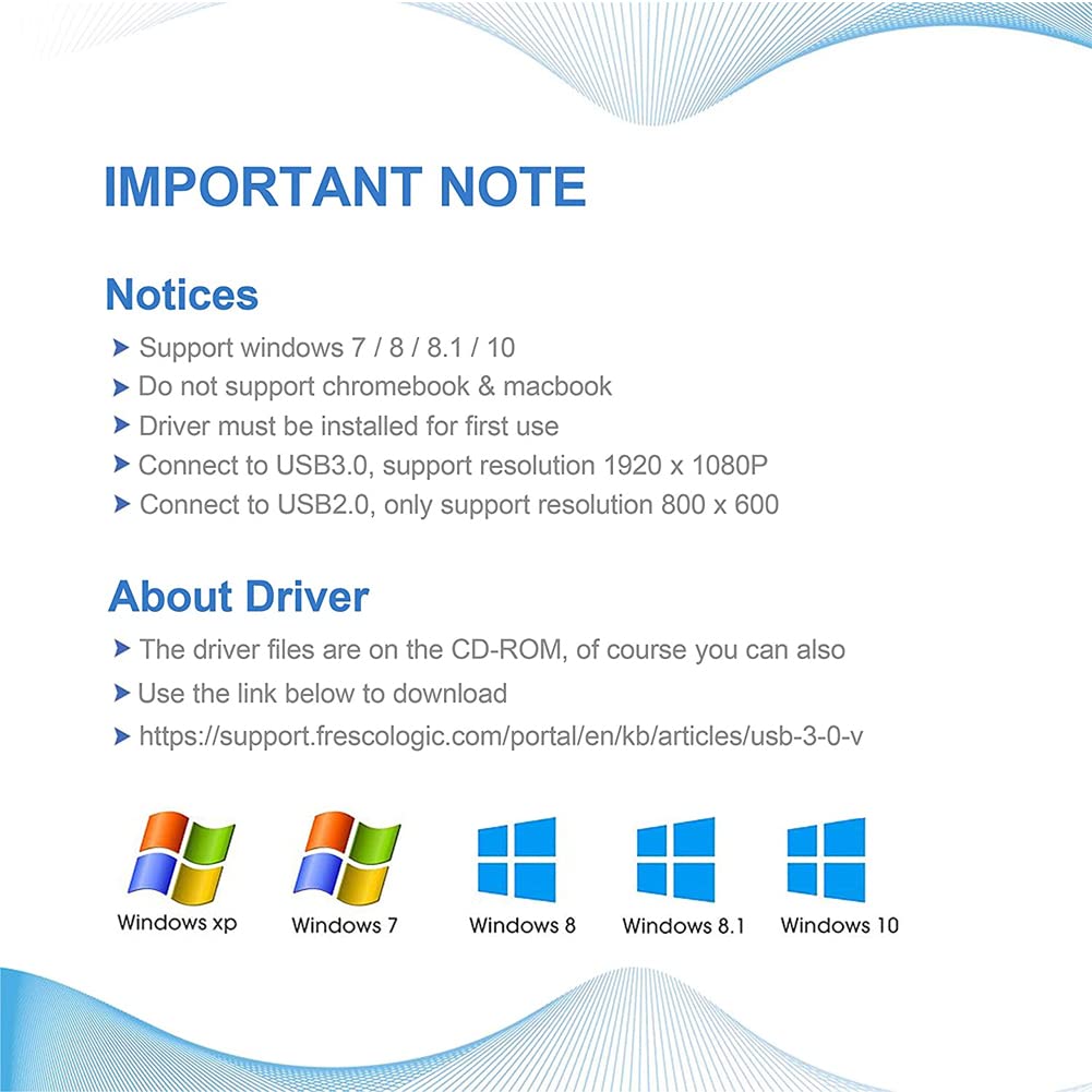 This USB 3.0 to VGA Adapter is used to connected a USB-enabled devices( such as laptop, desktop) with a VGA-enabled devices( such as monitor,projector, TV) for multi-monitor solution,extending working space with split-screen, mirroring display, etc HIGH RESOLUTION If connected to USB3.0 devices, resolution is adjustable and the maximum resolution can be up to 1920×1080@60Hz(1080p), if connected to USB2.0 devices, resolution is 800×600@60Hz. HIGHLIGHTS Leverages the adoption of USB 3.0 providing fast and smooth signal transmission. Backward compatible with USB2.0 computers. COMPATIBLE LIST PC Laptop Windows 7/8/8.1/10,Desktop, Laptop, PC,Monitor, Projector, HDTV, Raspberry Pi, Roku, Xbox and More,[Not Support Chromebook]