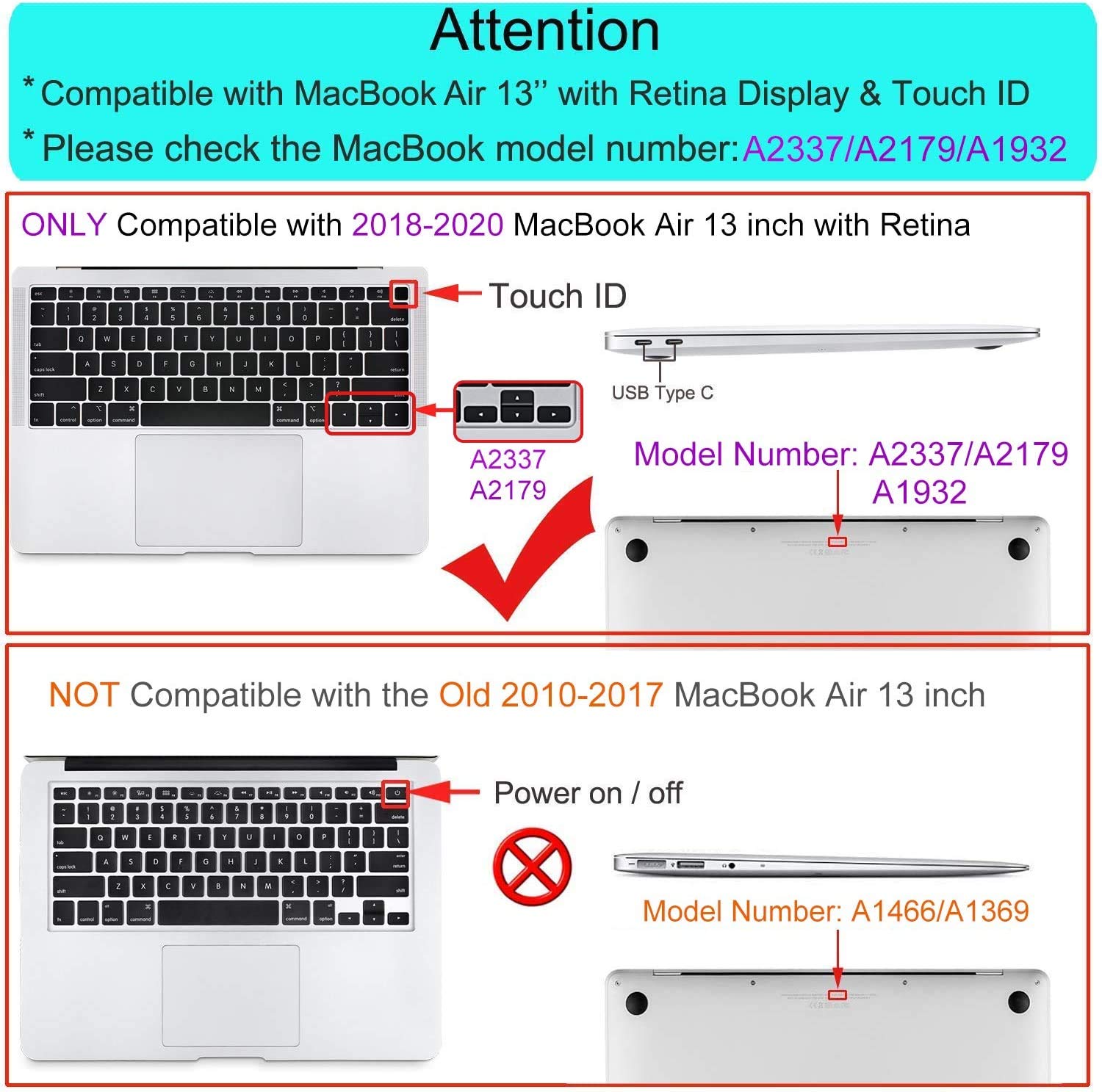 Designed ONLY to be compatible with MacBook Air 13 inch with Retina Display and Touch ID 2022 2021 2020 2019 2018 Release (Models: A2337 M1 A2179, A1932 – MGN63LL/A, MGND3LL/A, MGN93LL/A, MGN73LL/A, MGNE3LL/A, MGNA3LL/A, MWTJ2LL/A, MVH22LL/A, MWTL2LL/A, MWTK2LL/A, MVH52LL/A, MVH42LL/A, MVFH2LL/A, MVFM2LL/A, MVFK2LL/A, MVFJ2LL/A, MVFN2LL/A, MVFL2LL/A, MRE82LL/A, MREE2LL/A, MREA2LL/A, MRE92LL/A, MREF2LL/A, MREC2LL/A)