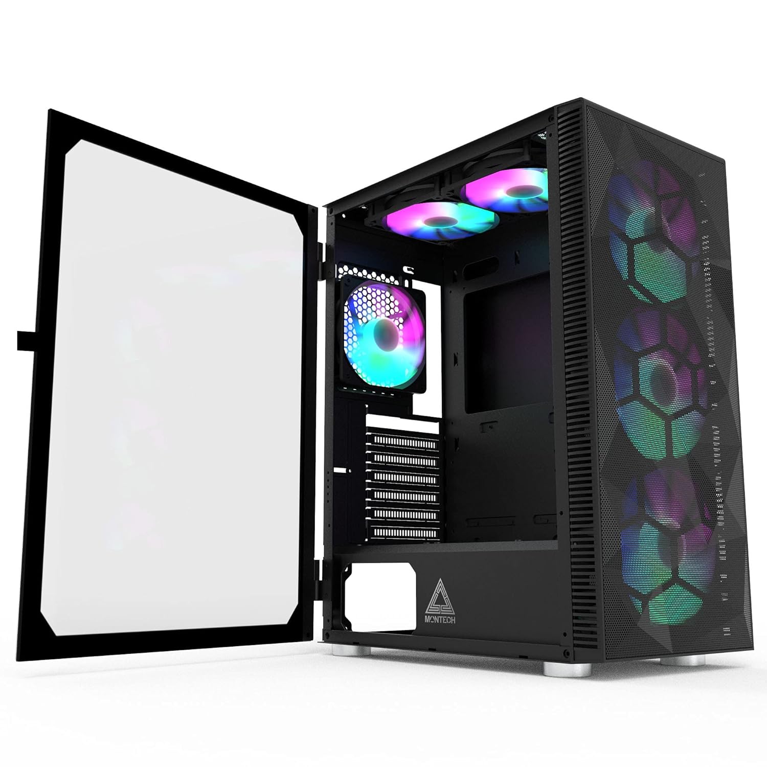 Montech X3 Mesh, 6 Fans – 3x 140mm & 3x 120mm Fixed RGB Lighting Fans, ATX Mid-Tower PC Gaming Case, USB3.0, Door Open Tempered Glass Side Panel, High Airflow, Black