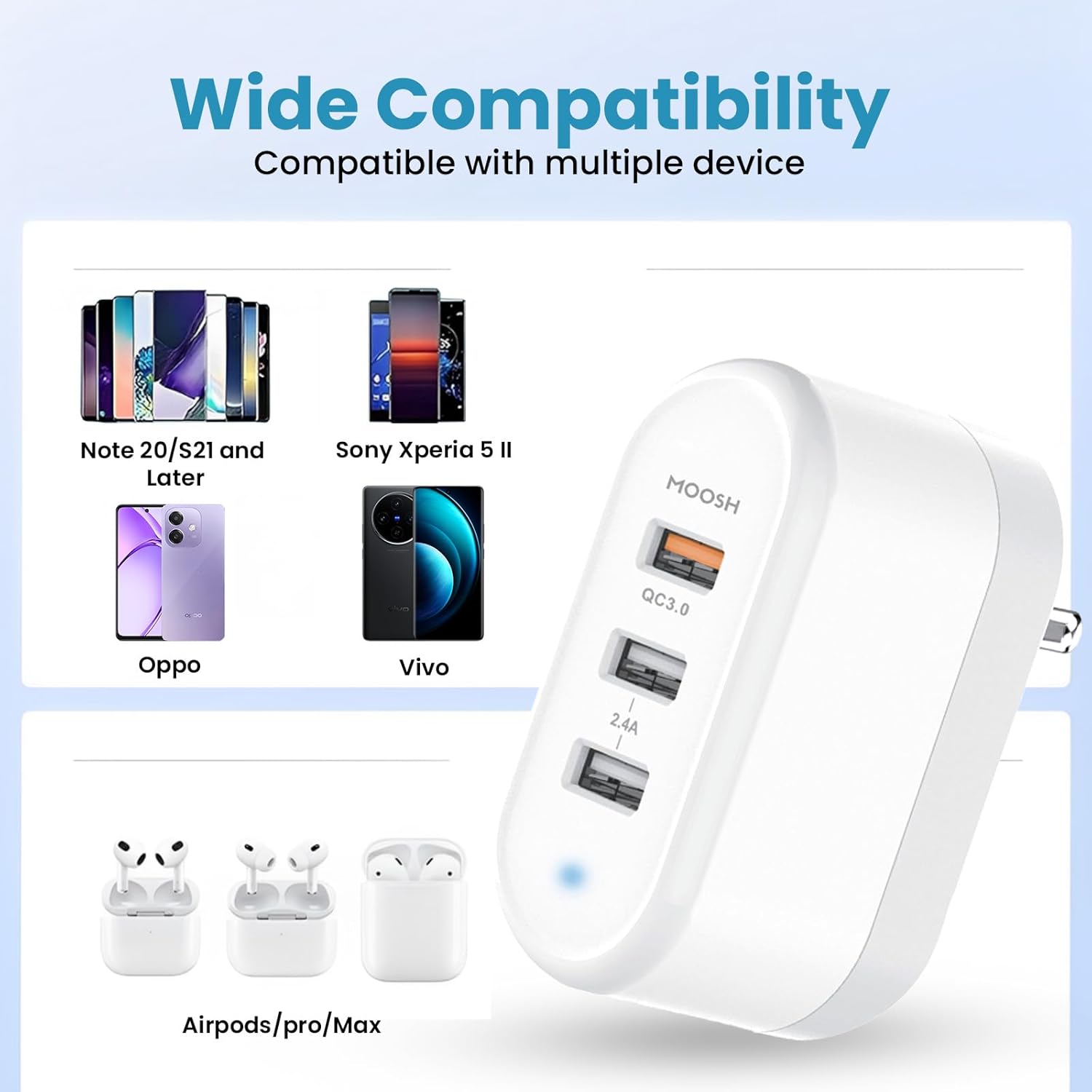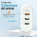 SMART POWER PORTS = MOOSH 3 USB Port Smart Wall Charger with Quick Charge 3.0 (QC) Technology that provide up to 18W (12V/1.5A 9V/2A 6V/3A). Plus, Dual USB 2.4A Charging, Breaks the speed limit by simultaneously charge 3 devices up to 1. 5 hours faster than standard chargers, leaving them in the dust