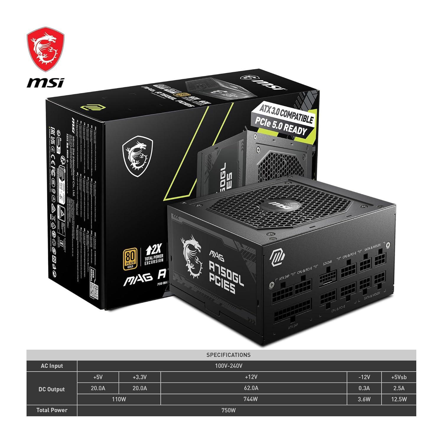 Be the first to review “MSI MAG A750GL PCIE5 Power Supply Unit, 750W, 80 Plus Gold, Fully Modular, ATX 3.1, PCIe 5.1 GPU Support, 120mm FDB Fan, Full-Bridge LLC, Flat Black Cables – 7 Year Warranty” Cancel reply