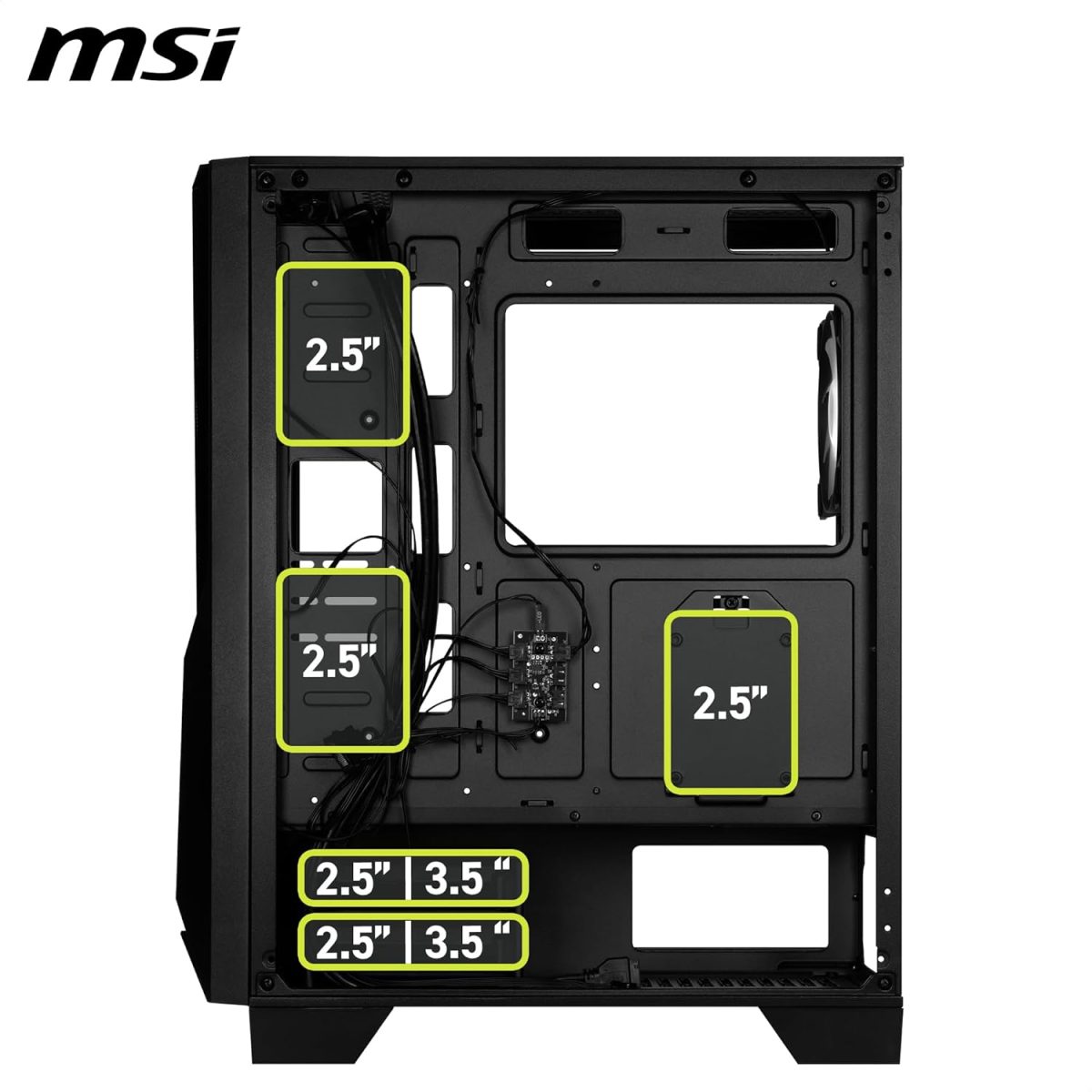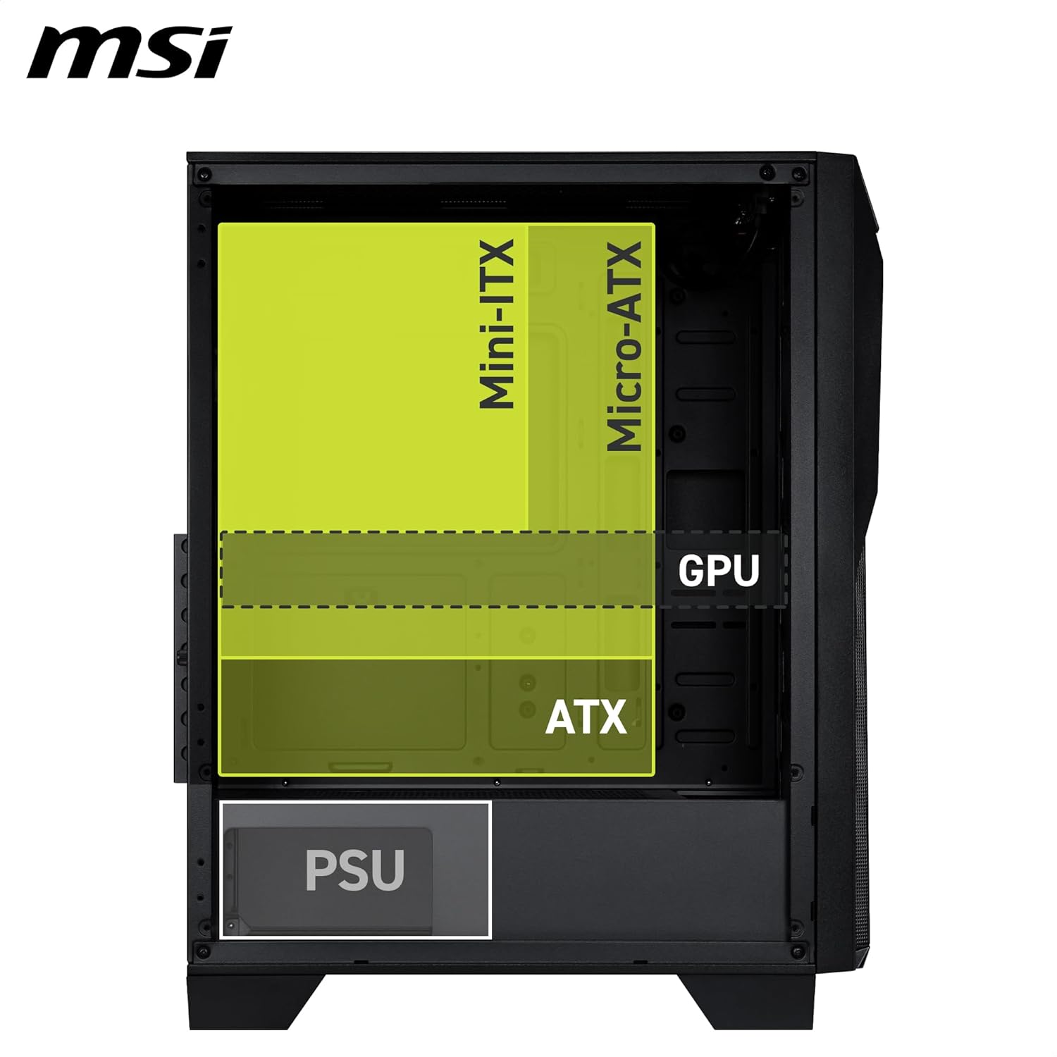 MAG FORGE 130A AIRFLOW: BEYOND THE POWER The MAG FORGE 130A AIRFLOW is a compact, value-focused PC case with excellent compatibility for PC builders. It enables quick, clean assembly with a tool-free tempered glass side panel that provides a clear view of your components. The interior offers ample space for graphics cards up to 330 mm in length and supports up to eight case fans, offering great customization options. It comes pre-installed with three 120 mm Auto-RGB fans on the front panel and one 120 mm Auto-RGB fan at the rear. All four fans are connected to a hub with switchable LEDs, allowing users to create a dynamic Auto-RGB setup to fully showcase their gaming rigs.