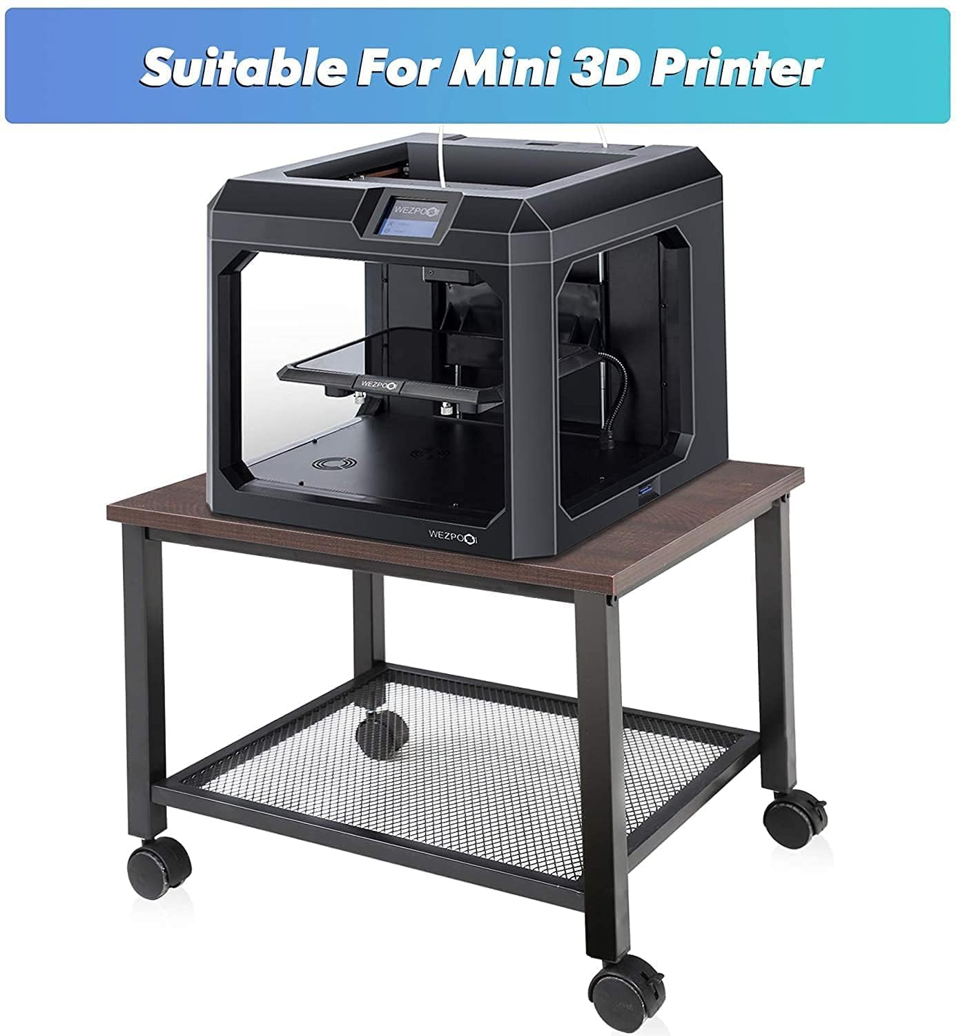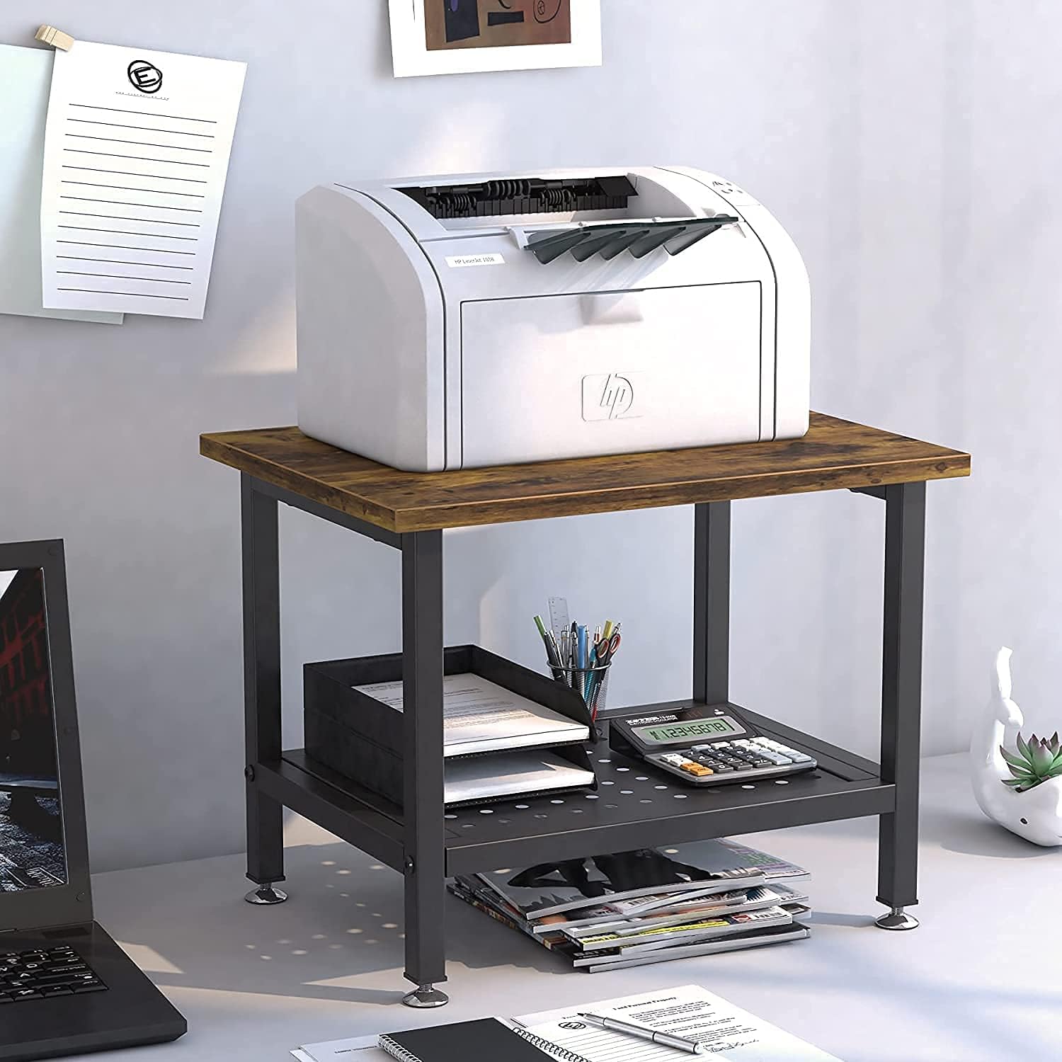 【PERFECT SIZE FOR ALL PRINTERS】 Home printer stands Dimensions: 15.7”(L)*11.8”(W)*11.8”(H), the height between two shelves is 7.1”. Max loading capacity: 120 Pounds. Printer shelf has successfully carried hundreds of different printers, fax machines, scanner or small laser jet and etc. Professional test over 1000 times, please feel free to use it.