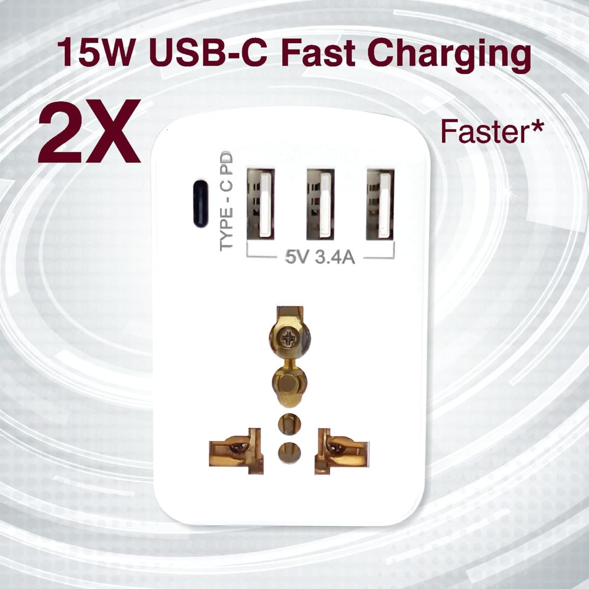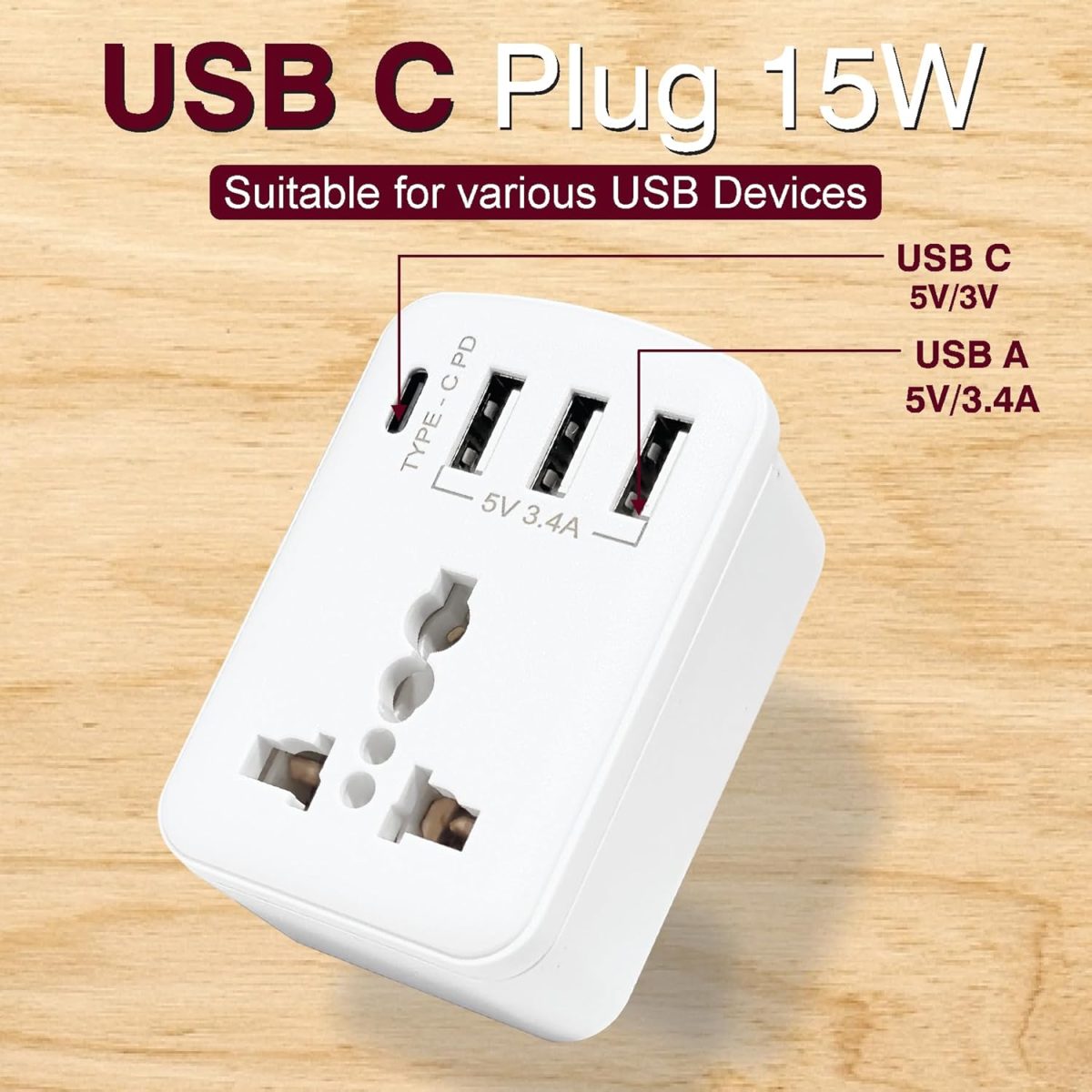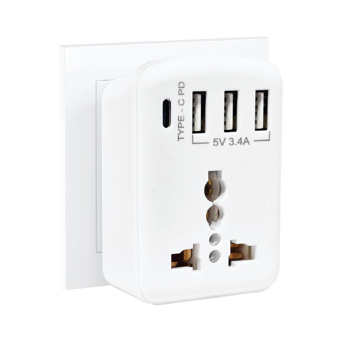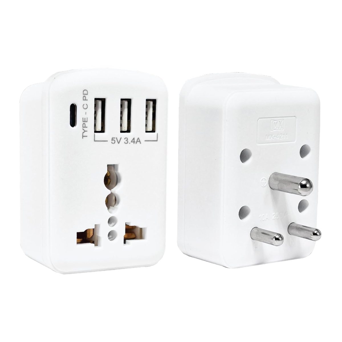 MX Universal Travel Adapter with USB-C PD (5V/3A) & 3 USB Ports – 5-in-1 Worldwide Multi Plug Charger (100-250V AC, Type D) Compact International Power Adapter for Travel
