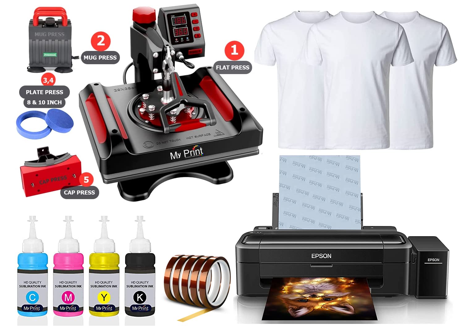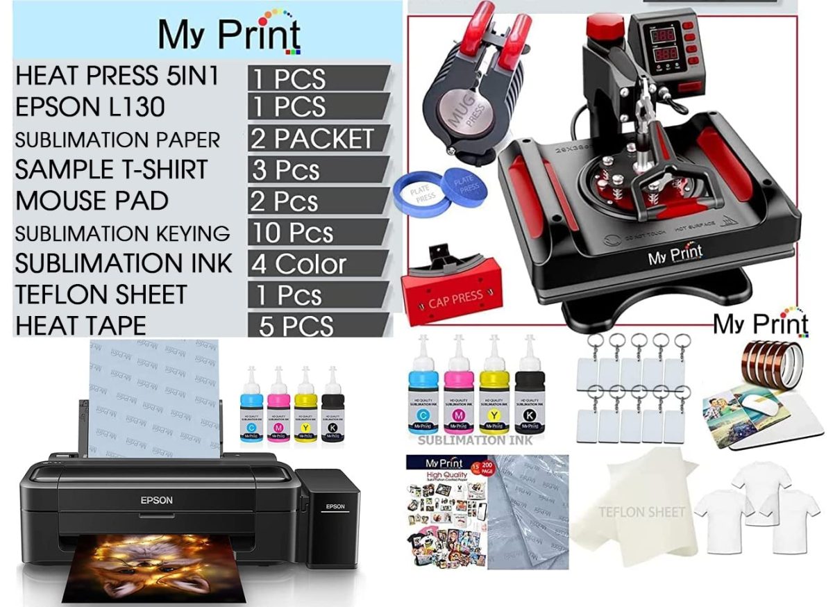 MY PRINT | Complete SublimationPrinting Setup | with Double Heating Tube Combo 5in1 Heat Press with Sublimation Print L130 with Sample Product | for Business Supply use