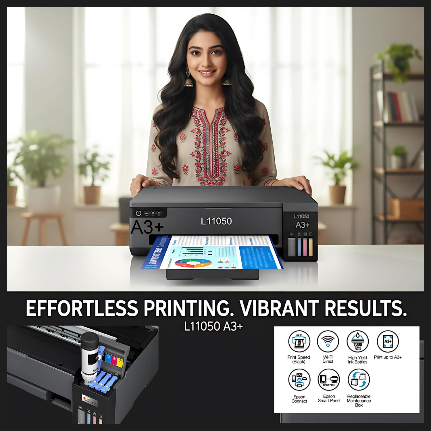 A3 Size Capability – Prints large formats up to A3, ideal for posters, charts, and marketing materials.