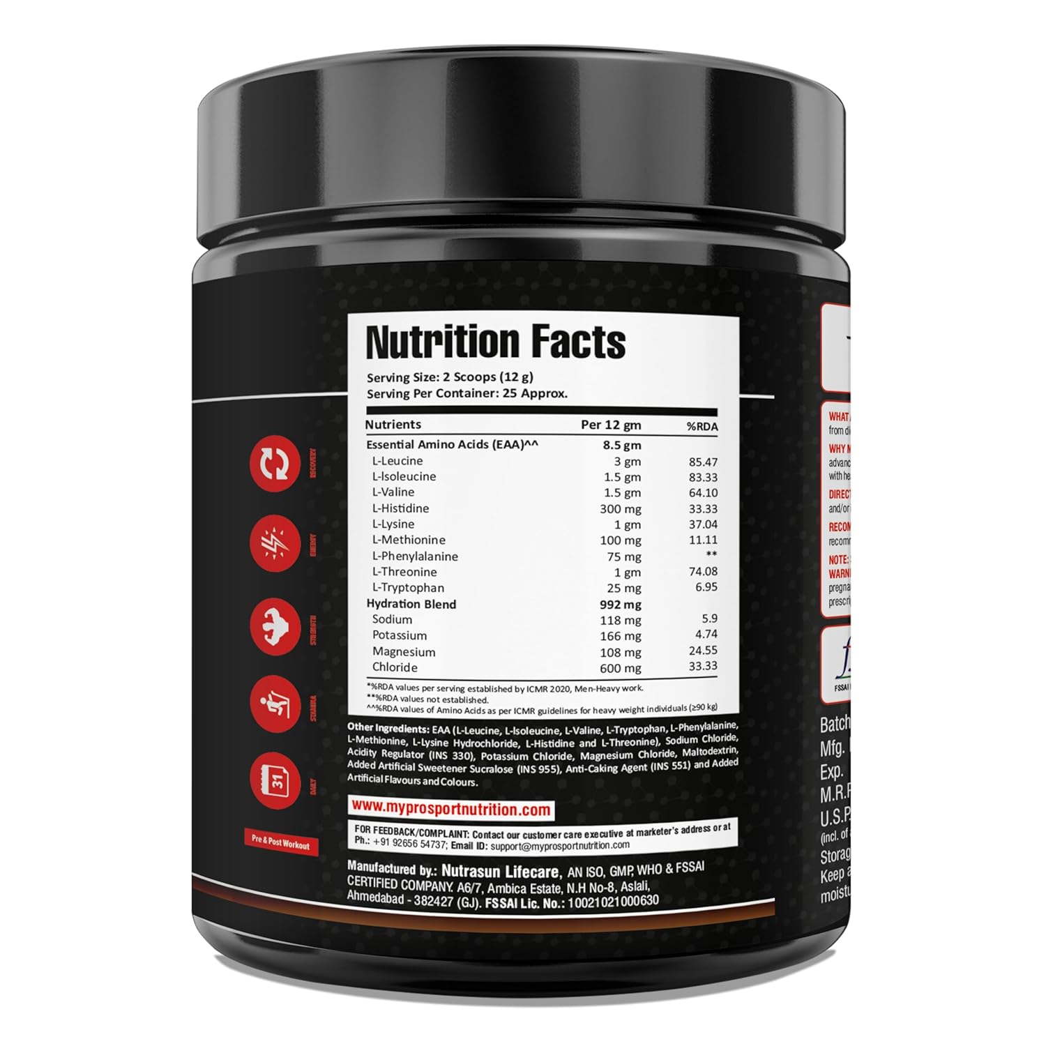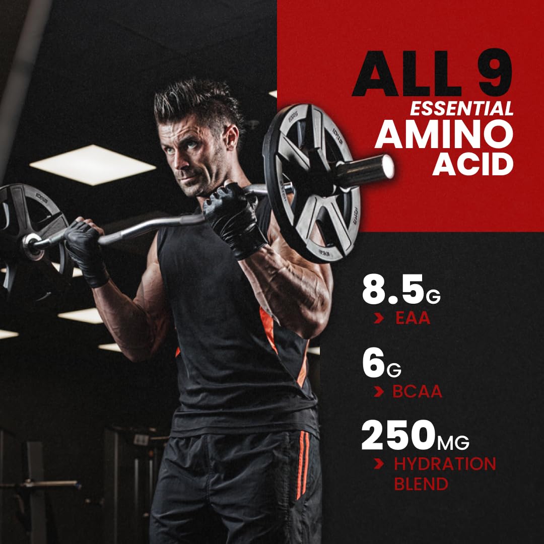 EAA:- 9 Essential Amino Acids (EAA) with 6g of BCAA (3:1.5:1.5) with added Hydration Blend
