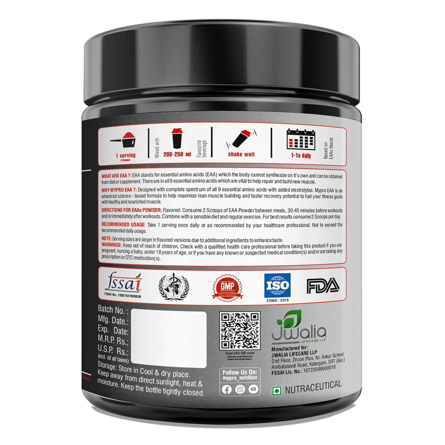 Manufacturer ‏ : ‎ JWALIA LIFECARE LLP, JWALIA LIFECARE LLP. Godown No. A/4, Ambika Estate,Aslali,Ahmedabad, Gujarat, 382427, support@myprosportnutrition.com