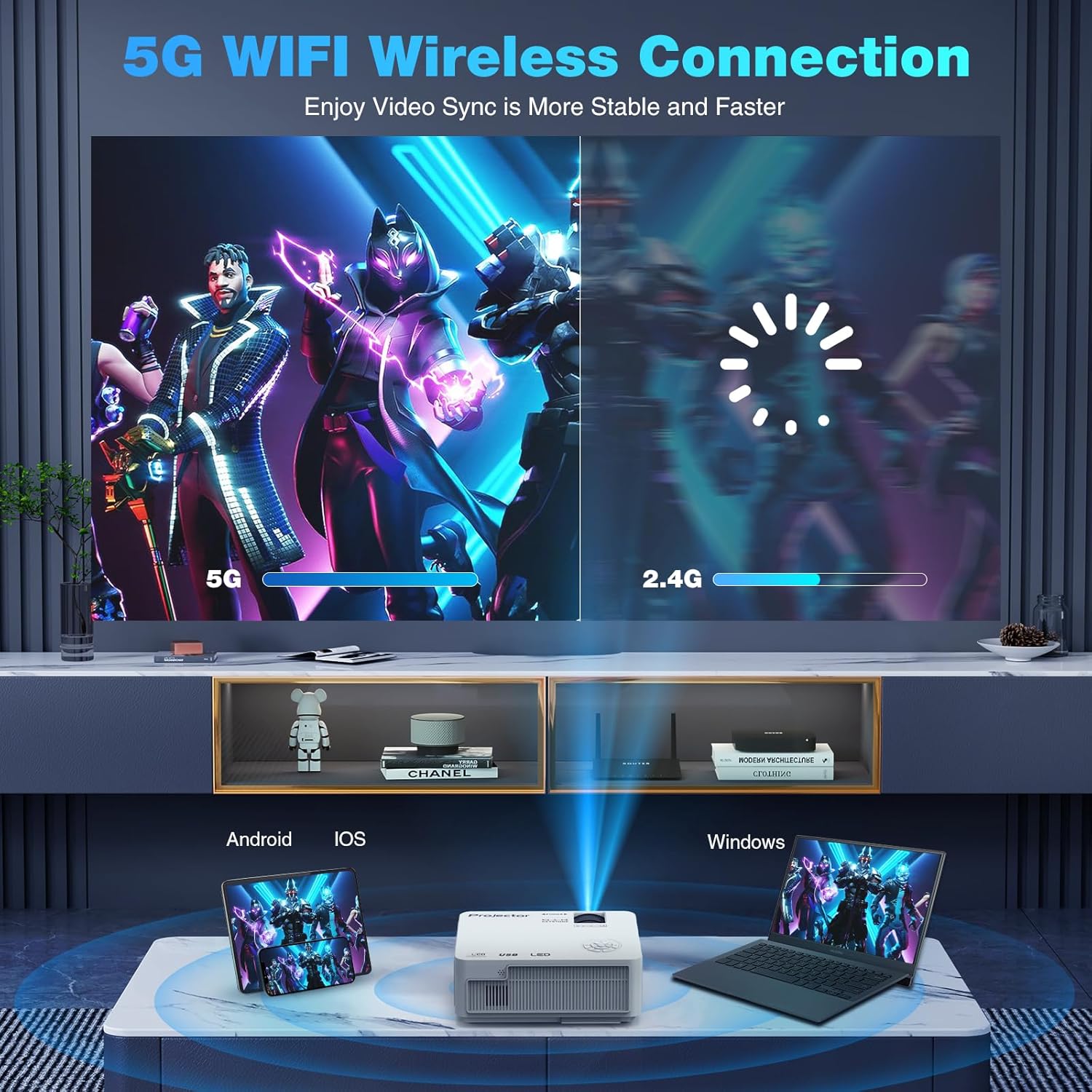 🎄***Latest 5G WIFI***With latest WiFi connection technology, this WIFI projector enables Android/IOS/Laptop device to synchronize screen mirroring by both 2.4G and 5G WiFi, Ultra-fast 5G WiFi offer you a much smoother, stable, and lag-free online videos/Gaming/Microsoft APP playing experience. (Copyright videos like Prime Video and more need to be connected to a TV stick (not included) or HDMI cable to watch)