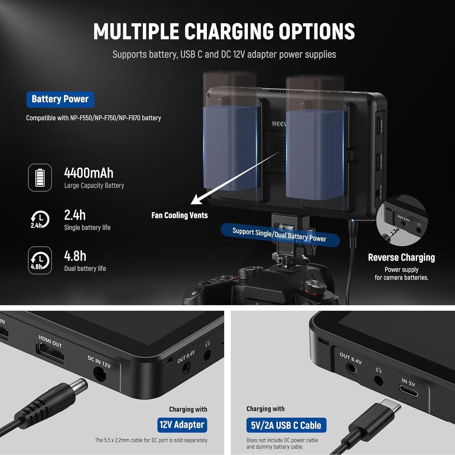 【Versatile Power Options】 This video monitor is compatible with NP-F batteries (NP-F550/750/970), a DC port (cable not included) and a type C charger. 2 NP-F750 4400 mAh batteries offer 2.4 hours of battery life each, or 4.8 hours combined. They can be recharged via 5V/3A fast chargers or more, or portable chargers (3A output) via the supplied USB to Type-C cable. It can also be used as a dummy battery for camera thanks to a DC 8V/1.5A output.