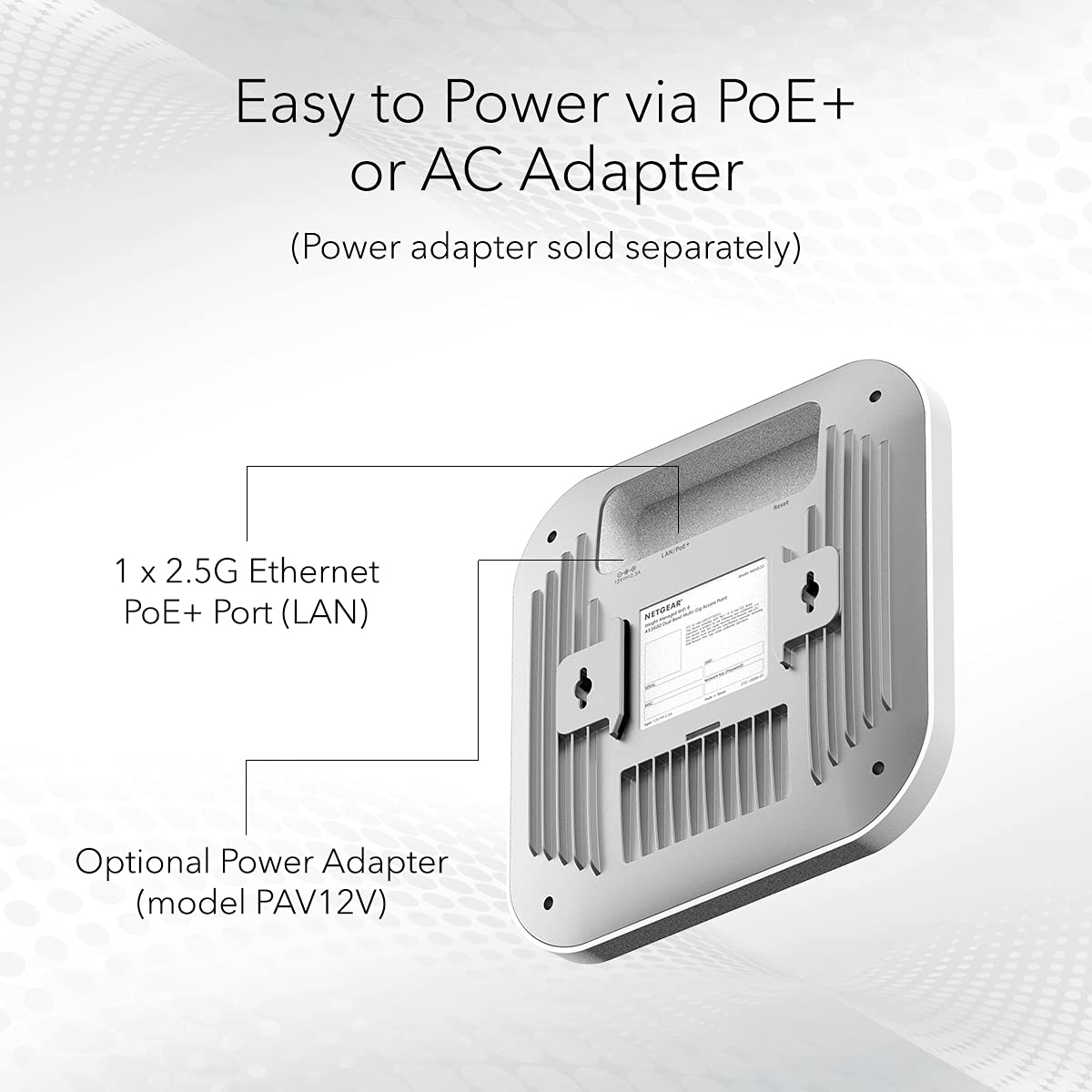 Simplified deployment with PoE+, or power using the optional PAV12V power adapter (sold separately).