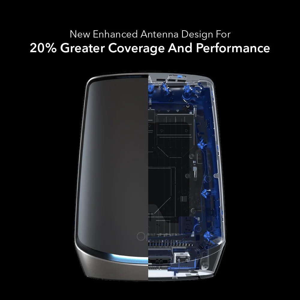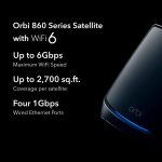 WiFi Coverage 2,700 sq. ft. Processor Quad-core 2.2GHz processor Physical Specifications Height: 10 inches (254mm) Width: 7.5 inches (190.5mm) Depth: 2.8 inches (71.12mm) Weight: 2.86 lbs (1.29kg) Requirements Fast speed internet connection to existing modem or gateway Package Content 1x Orbi WiFi 6 Satellites (RBS860B), 1x 19V/3.16A power adapters, 1x Quick Start Guide Network Security 802.11i, 128-bit AES encryption with PSK. Easy to setup separate & secure Internet access for guests Antenna Eight (8) internal antennas with amplifiers AX6000 Tri-Band WiFi Simultaneous Tri-Band WiFi with dedicated backhaul Radio 1: IEEE 802.11b/g/n/ax/2.4GHz – 1024 QAM support Radio 2: IEEE 802.11a/n/ac/ax/5GHz – 1024 QAM support Radio 3: IEEE 802.11a/n/ac/ax/5GHz – 1024 QAM support Speed AX6000 (2400 + 2400 + 1200Mbps) Ports 4x 10/100/1000Mbps Gigabit Ethernet LAN ports each