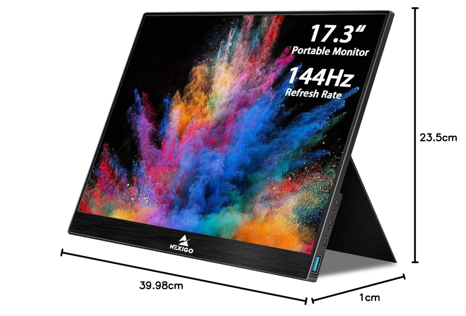 The NexiGo 17.3 inch 1080P FHD IPS-panel 144hz Portable Monitor, Flicker-free Technology for smooth and crisp clear visuals, Built-in dual speaker and a 3.5 mm headphone jack for immersive sound.