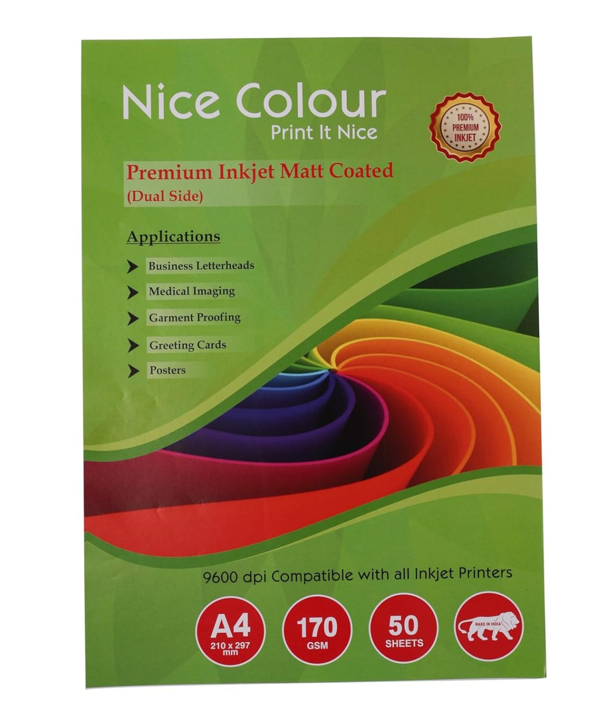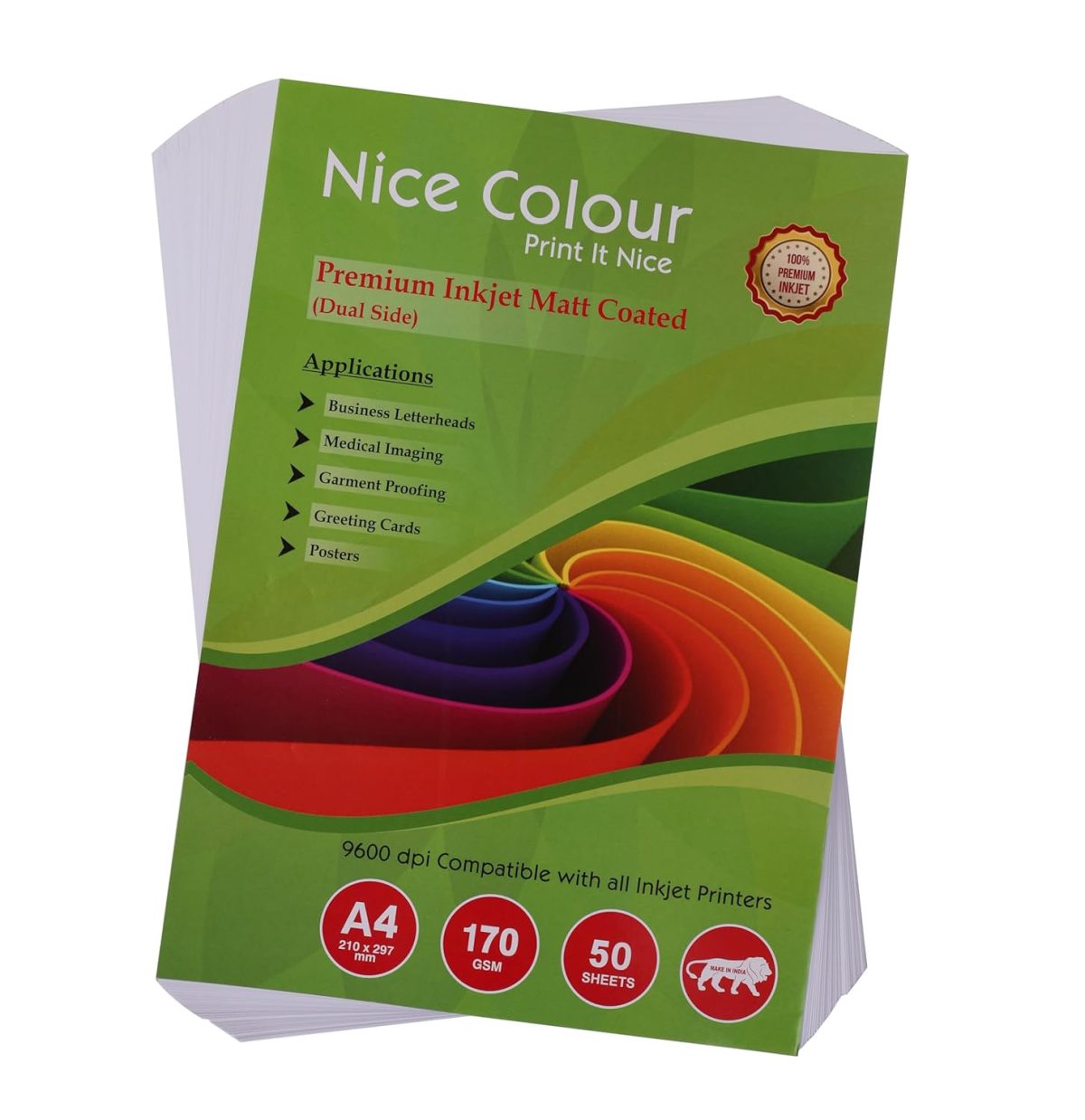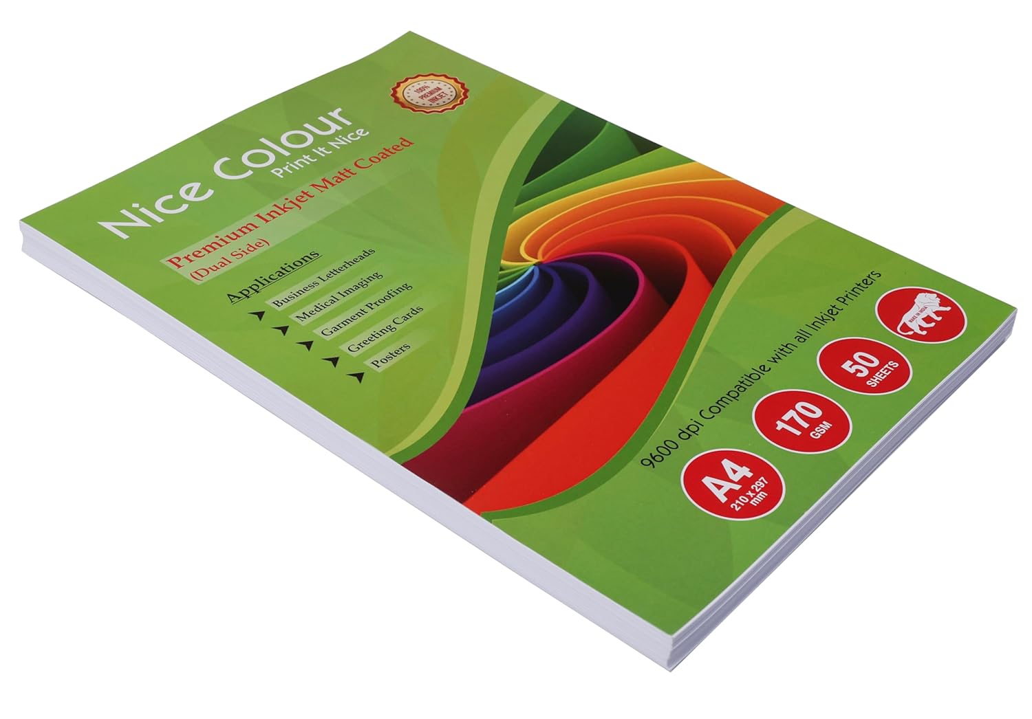 Nice Color Premium Inkjet Matt Coated Dual Side Printing Paper A4 Size 170 GSM 50 Sheets Matte Finish High Resolution Inkjet Printer Paper Photo Quality Paper