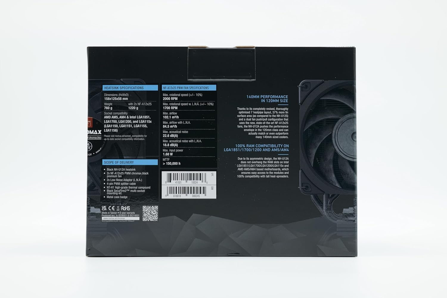 Dual state-of-the-art NF-A12x25 120mm fans with Low-Noise Adaptors and PWM for automatic speed control: full cooling performance under load, whisper quiet at idle!