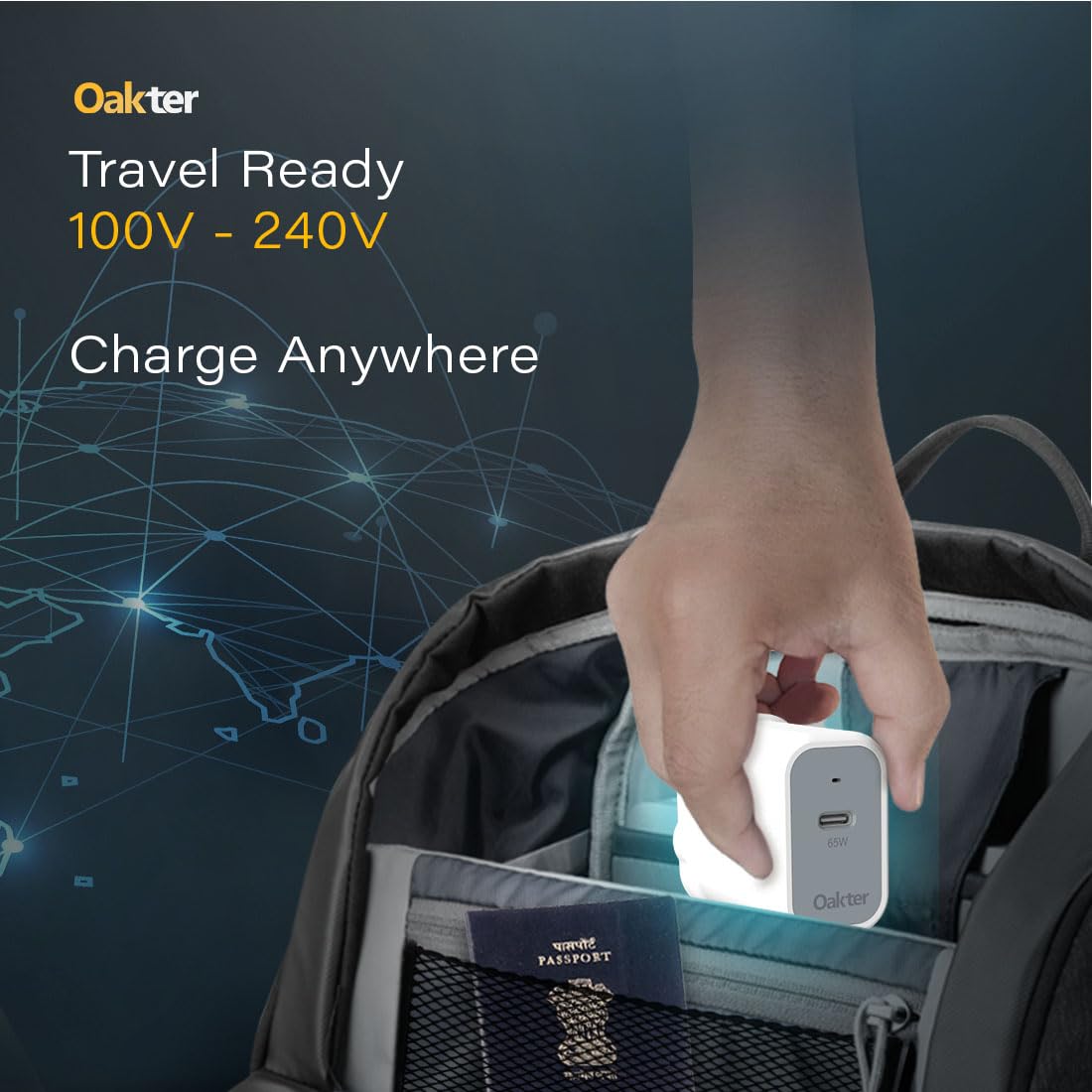 Oakter 65W Fast Charger | GaN Charger with 1.5m USB-C Cable | Type-C Fast Charging Adapter for Laptop, Mobile, MacBook, iPhone 15 & Newer, iPad, Samsung | White | 3-Pin Plug