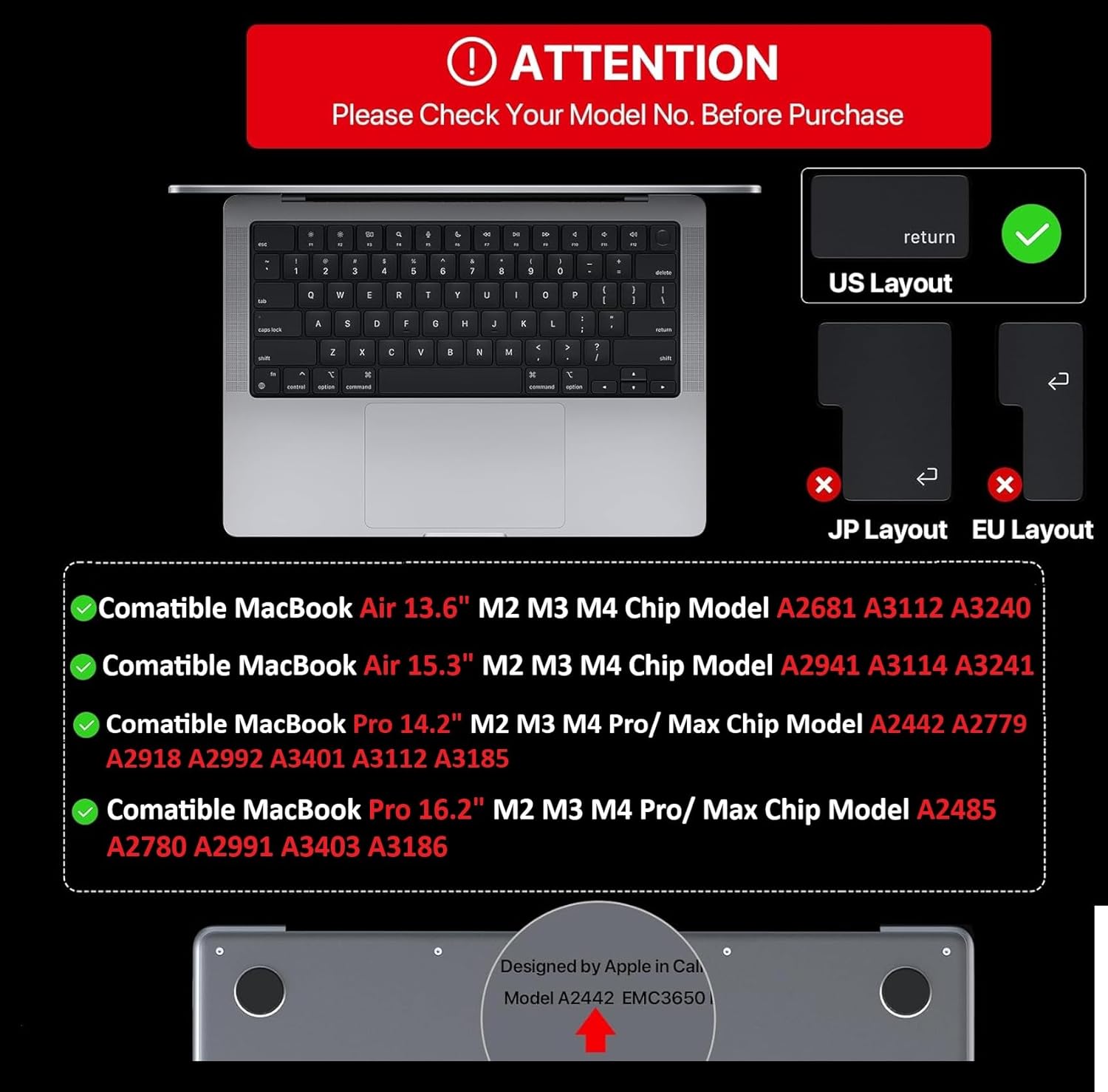 ✅[𝐂𝐨𝐦𝐩𝐚𝐭𝐢𝐛𝐢𝐥𝐢𝐭𝐲] : – This keyboard cover is specially designed for 2025-2021 MacBook Air 13 inch M4 M3 M2 Chip [𝗔𝟯𝟮𝟰𝟬 𝗔𝟯𝟭𝟭𝟯 𝗔𝟮𝟲𝟴𝟭] & MacBook Air 15 inch 2025-2021 M4 M3 M2 Chip [𝗔𝟯𝟮𝟰𝟭 𝗔𝟯𝟭𝟭𝟰 𝗔𝟮𝟵𝟰𝟭] . US Layout. ⚠️⚠️⚠️ 𝐏𝐥𝐞𝐚𝐬𝐞 𝐜𝐡𝐞𝐜𝐤 𝐲𝐨𝐮𝐫 𝐌𝐚𝐜𝐛𝐨𝐨𝐤’𝐬 𝐦𝐨𝐝𝐞𝐥 𝐧𝐮𝐦𝐛𝐞𝐫 “𝐀𝐱𝐱𝐱𝐱” 𝐨𝐧 𝐭𝐡𝐞 𝐛𝐨𝐭𝐭𝐨𝐦 𝐨𝐟 𝐭𝐡𝐞 𝐥𝐚𝐩𝐭𝐨𝐩 𝐚𝐧𝐝 𝐜𝐨𝐦𝐩𝐚𝐫𝐞 𝐘𝐨𝐮𝐫 𝐤𝐞𝐲𝐛𝐨𝐚𝐫𝐝 𝐥𝐚𝐲𝐨𝐮𝐭 𝐰𝐢𝐭𝐡 𝐩𝐫𝐨𝐝𝐮𝐜𝐭 𝐢𝐦𝐚𝐠𝐞.