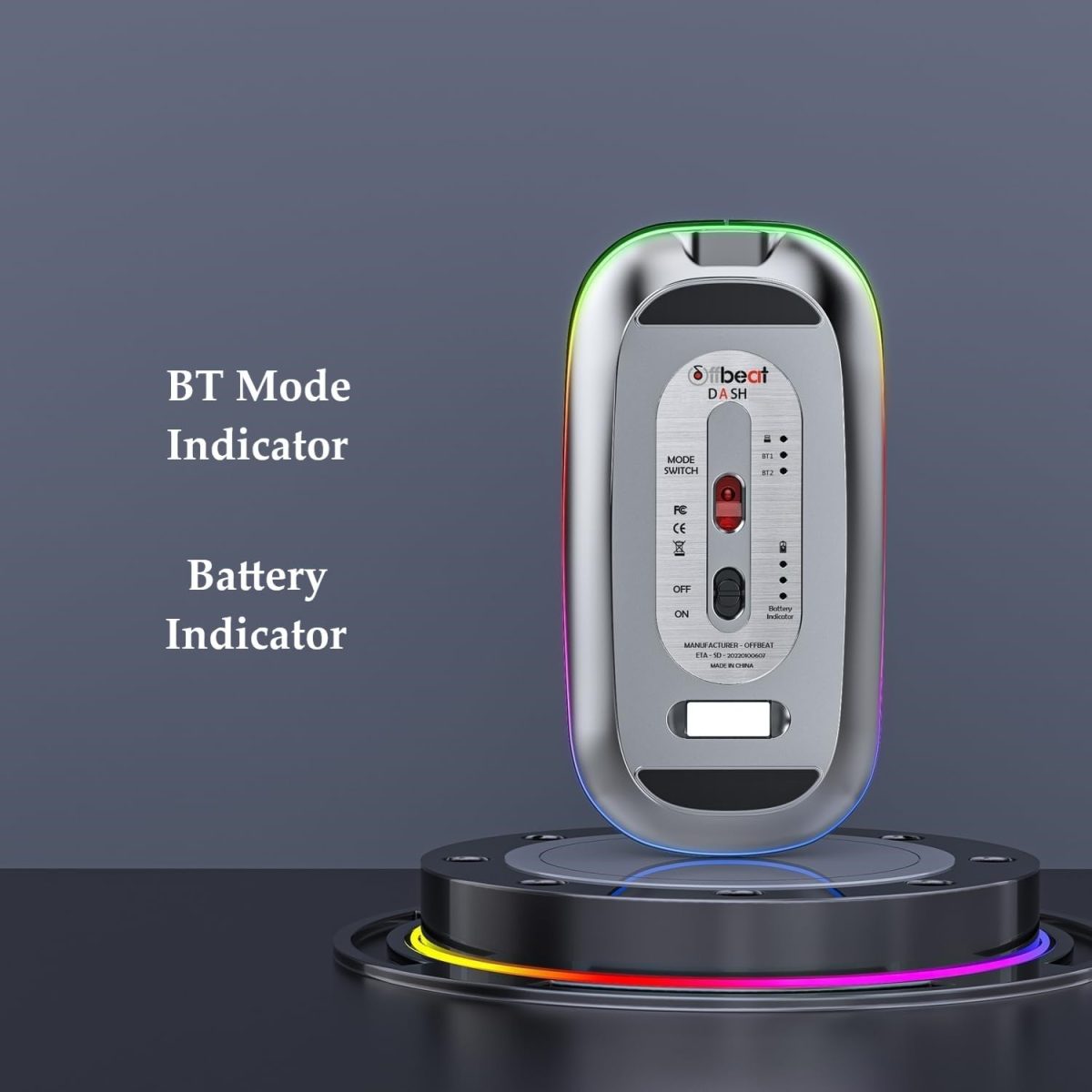 DUAL BLUETOOTH MODE Dual BT mode with 5.1 + 5.0 connectivity 2.4 Ghz WIRELESS Third device connectivity through 2.4 Ghz Wireless connection BUILT-IN BATTERY Rechargeable Lithium ion battery with 60+ hours run time TYPE C Type C charging port for fast charging under 60 mins BATTERY INDICATOR Battery indicator at the bottom of the mouse to displacy battery levels SILENT CLICK & METAL SCROLLER Silent noiseless clicks with a precision focused metal scroller for smooth operations RGB LED LIGHTS RGB led lights for a Vibrant look
