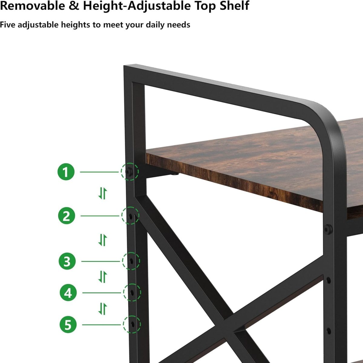 Height Adjustable Top Shelf: The top shelf of this 2 tier printer shelf is removable and height-adjustable with 5 levels, so you can customize the space between top and bottom shelf with clear height 12.3in, 9.6in, 7.6in, or 5.6in to accommodate differently sized items. Experience the flexibility and versatility of customizable storage options with this innovative computer tower stand