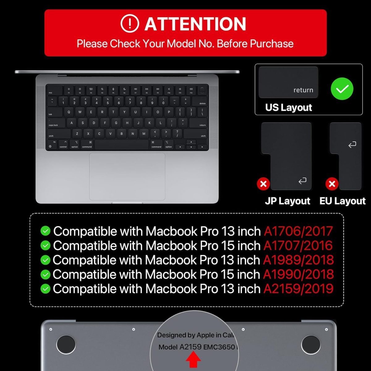 【Attention: Check Your Model】Does NOT fit M1 MacBook Pro. Engineered to fit precisely to the keyboard of your 2016 2017 2018 2019 Macbook Pro13” &15” with Touch Bar (Apple Model Number A1706, A1707, A1989, A1990,A2159) US Keyboard Layout Only.