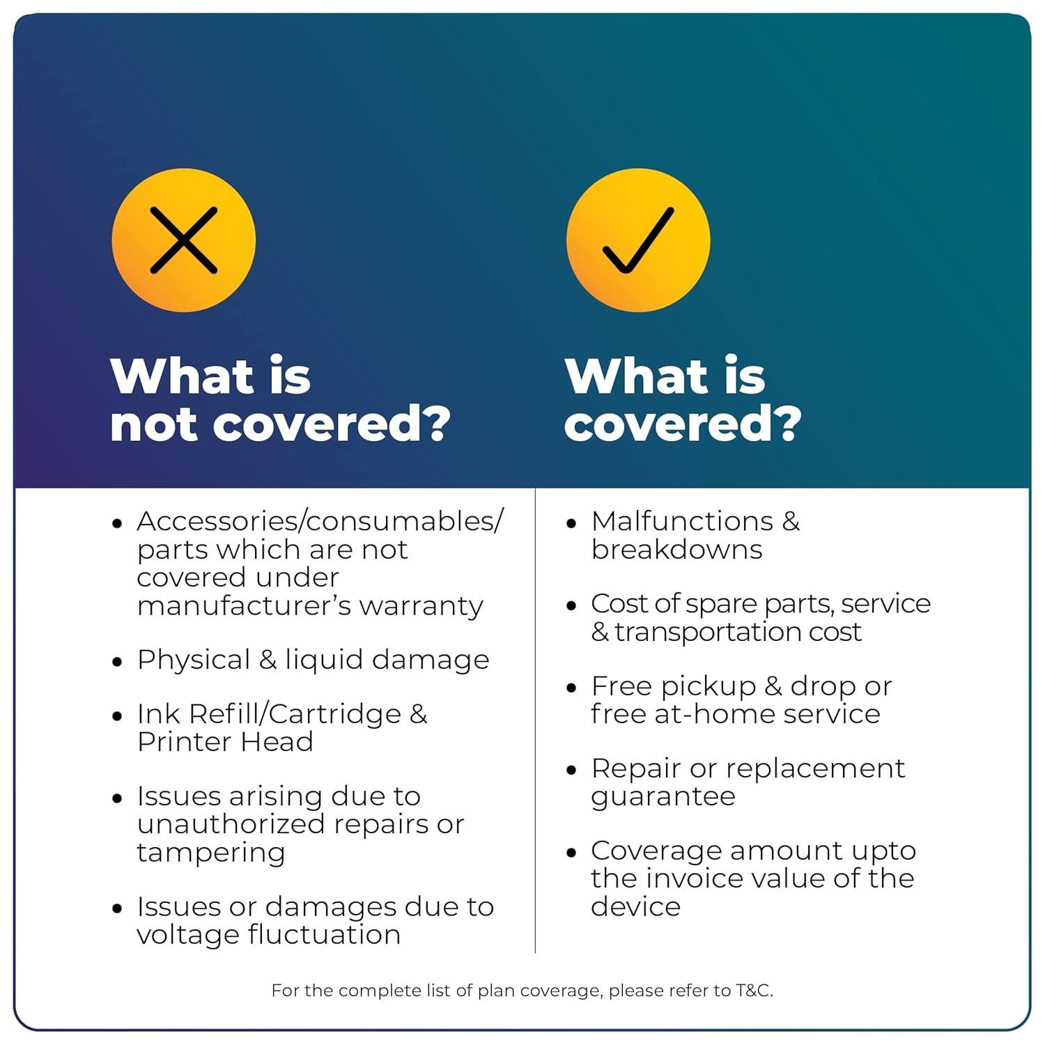 COVERAGE: The plan covers all defects & malfunctions under the original manufacturer’s warranty. The plan starts the day after the manufacturer’s warranty ends. It does not cover physical or liquid damage, accessories, consumables or parts that are not covered under the standard manufacturer’s warranty.