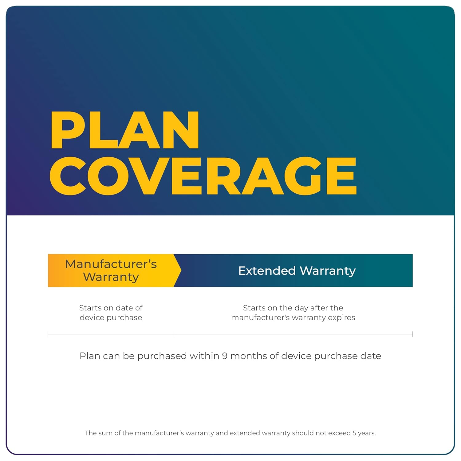ELIGIBILITY: The plan can be purchased only for new devices and WITHIN 9 MONTHS of device purchase. You can purchase this plan only for devices which have AT LEAST 1-YEAR manufacturer’s warranty valid in India. The sum of manufacturer’s warranty and extended warranty CANNOT EXCEED 5 YEARS.
