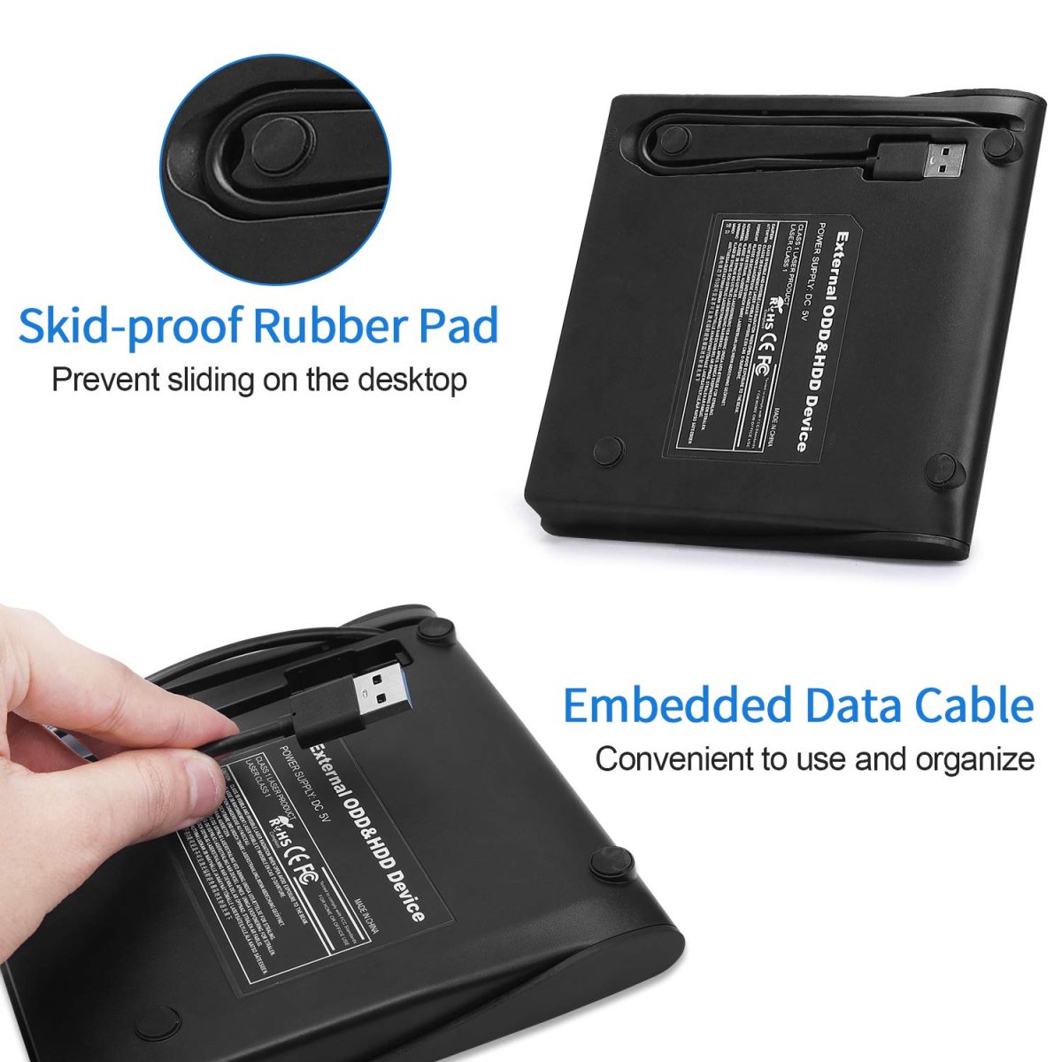 Supported formats: DVD-ROM, DVD-video, CD-R/RW, CD-ROM/XA, CD-ROM, CD-EXTRA, CD-TEXTSupported media types: CD-ROM, CD-R, CD-RW, DVD-ROM, DVD-R, DVD-RW, DVD+RW, DVD+R, DVD+R DL, DVD-R DL, DVD RAMRead Speed: CD-ROM: 24x Max; DVD-ROM: 8x Max; DVD-ROM(DL): 6x MaxWrite speed: 24x CD-R, 8x CD-RW, DVD±R: 8X Max; DVD±R DL: 4X Max; DVD-R±9: 2.4x MaxRewrite Speed: DVD+RW: 4X Max; DVD-RW: 4x Max; CD-RW: 10X Max; DVD-RAM: 3x MaxMemory Cache: 2MComputer Output for drive : 3V-5V (1.3A-2A) — Lower to this may cause a recognizing failure or reading failure.For Mac OS, use the mac command to eject disc.For Mac OS, the dvd drive icon shows after drive reads successfully the disc. So after you placed a disc into the drive, the dvd icon will not show up immediately.