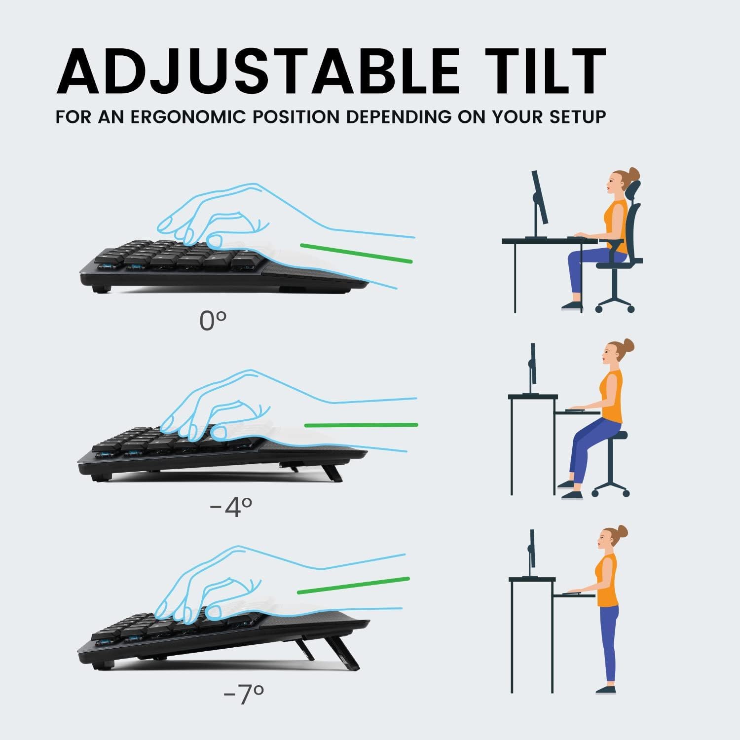INTEGRATED PALM REST WITH ADJUSTABLE TILT: Built-in wrist support with 3 angle settings (0°, -4°, -7°) helps reduce wrist pronation and improves ergonomic posture at any desk setup.