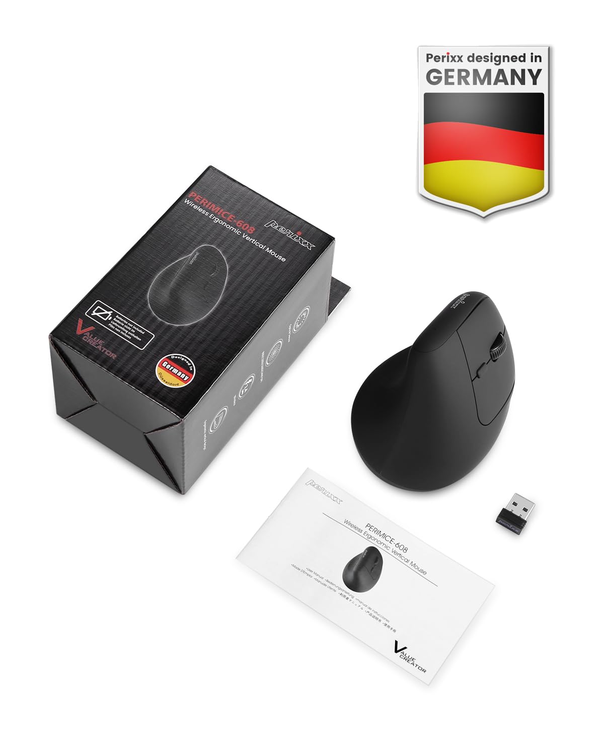 PERIMICE-608 Wireless Vertical Ergonomic Mouse – Right-Handed Design with 6 Buttons, Adjustable DPI (800/1000/1600) & 2.4 GHz Nano Receiver – Perixx