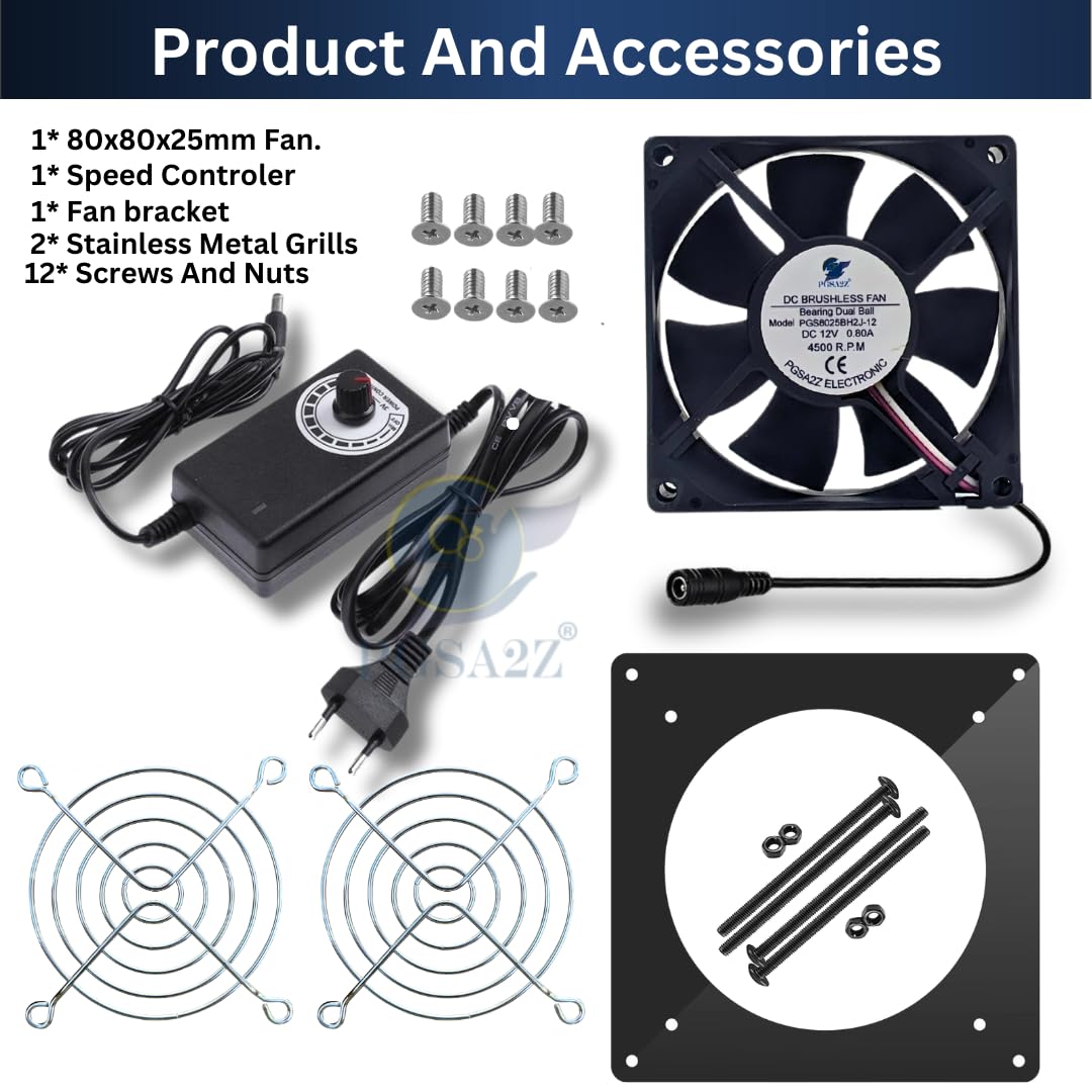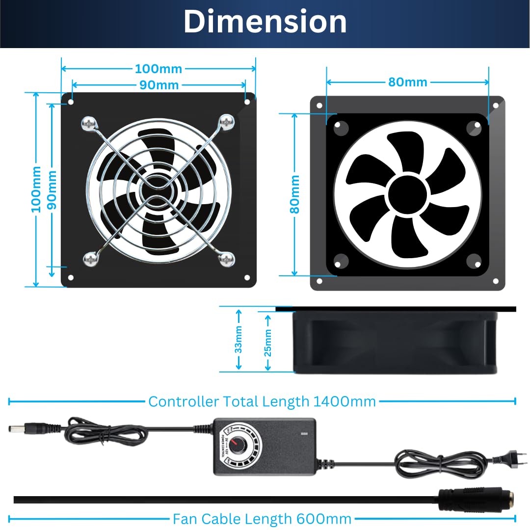 Efficient Cooling: Keep your PC, doorway receiver, Xbox, DVR, router, home theater, and AV cabinets running smoothly with our AC Plug Cooling Fan System. Versatile Compatibility: Designed to work seamlessly with 120V, 110V, and 220V power sources, ensuring compatibility across various setups. Customizable Cooling: Adjust the fan speed effortlessly with the variable speed controller, allowing you to tailor the cooling performance to your specific needs. Enhanced Airflow: The 80mm fan delivers optimal airflow, effectively dissipating heat and maintaining ideal operating temperatures for your devices. Easy Installation: Simple to install in any compatible system or cabinet, ensuring hassle-free setup and operation. Reliable Performance: Trust in the durability and performance of our cooling fan system to protect your electronic devices from overheating and extend their lifespan.