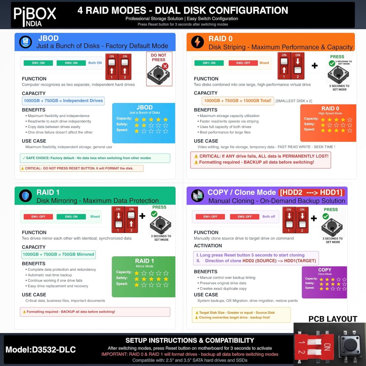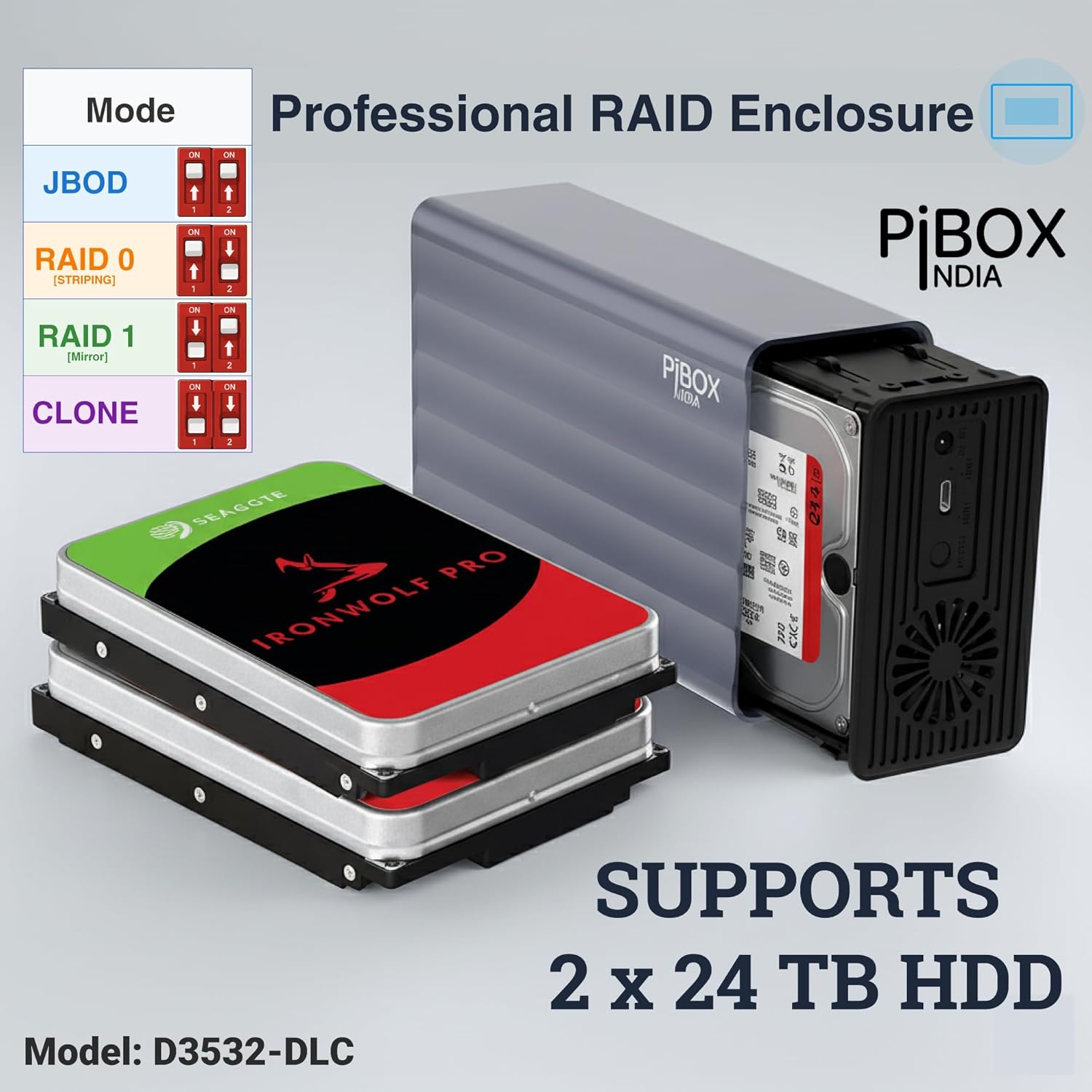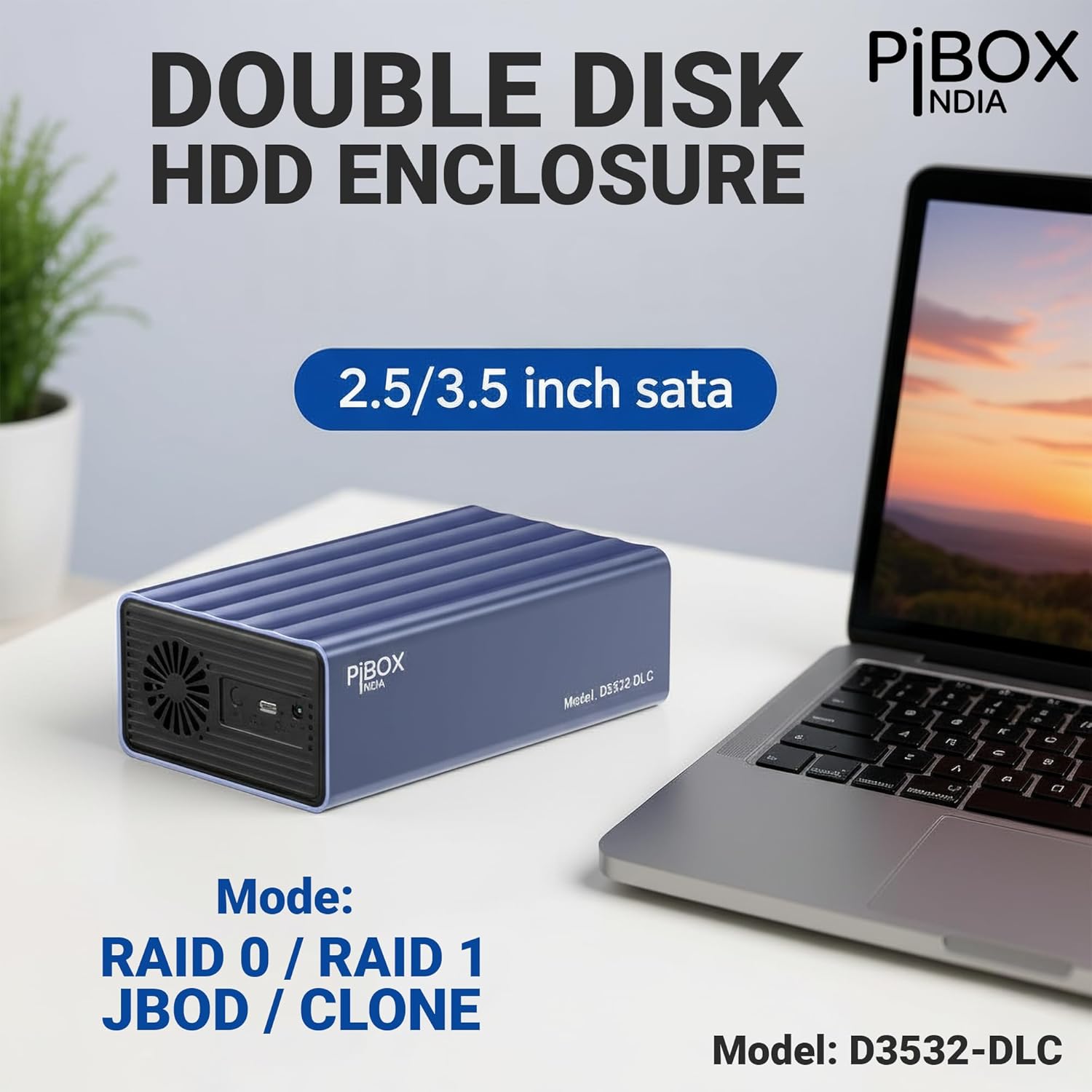 PiBOX INDIA D3532-DLC: 4 RAID Modes, 56TB Dual Bay SATA Enclosure, 6Gbps USB-C