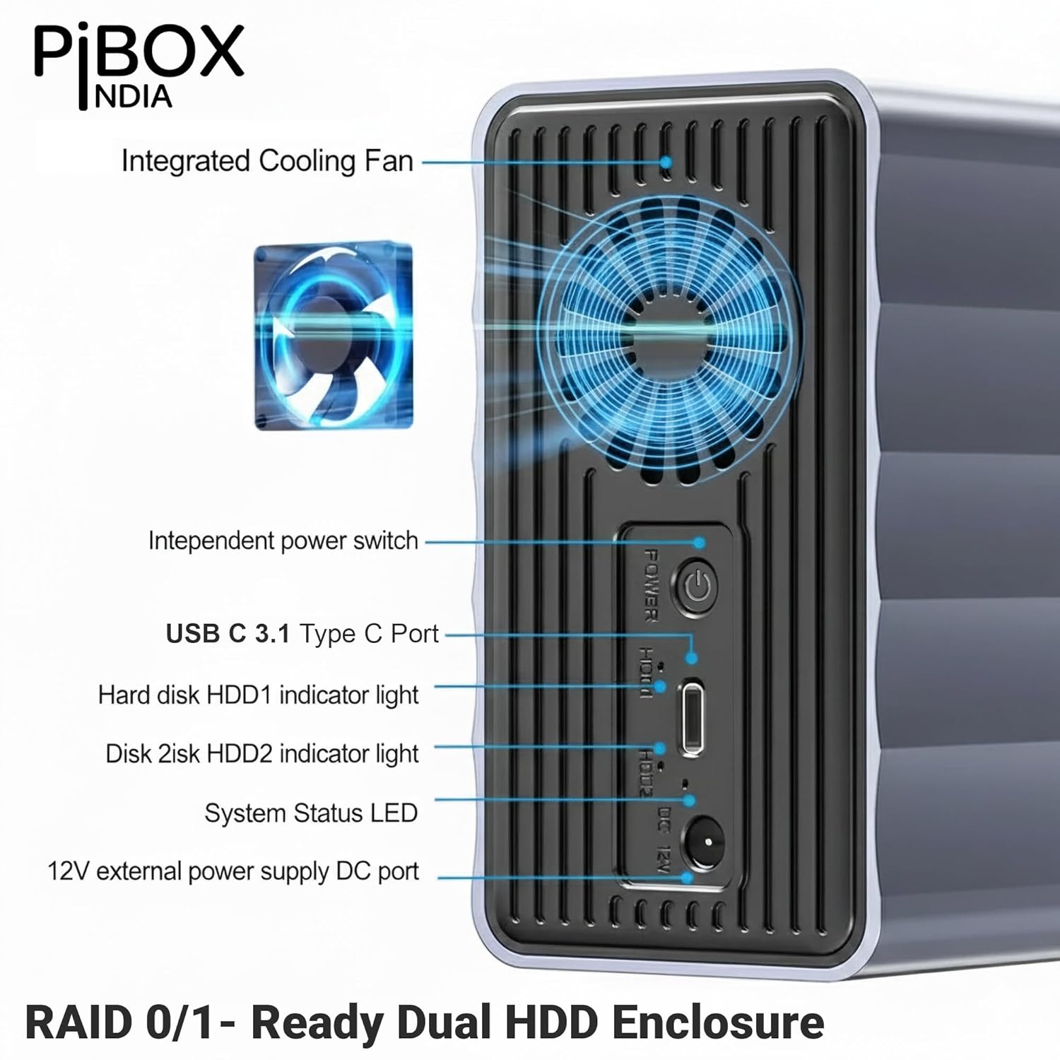 PiBOX INDIA Professional dual bay RAID enclosure supporting 3.5″/2.5″ drives up to 2x 28TB 56TB. Four RAID modes with 6Gbps USB 3.1 Type-C speed. Tool-free setup, cooling fan, status LEDs. Perfect for content creators and businesses needing reliable high-speed storage expansion and data protection.