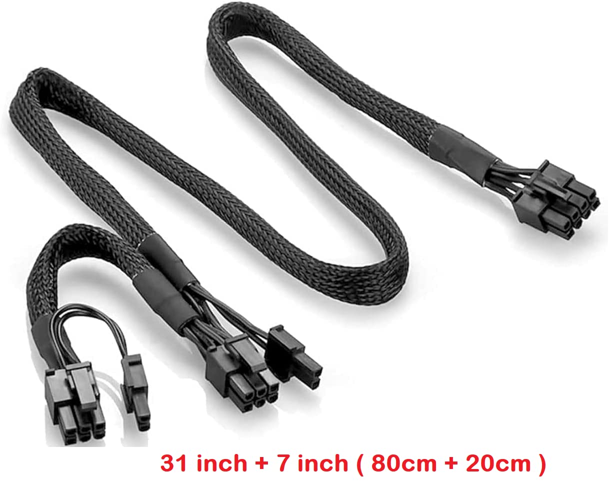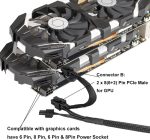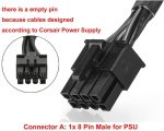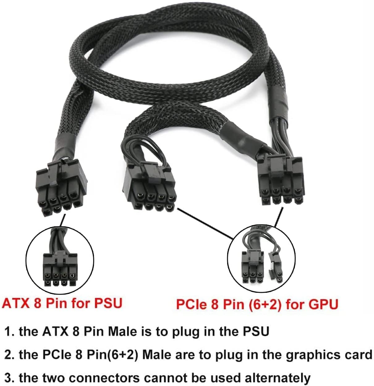 Pi+ (Pi Plus): 8P – Dual8P(6+2) ATX 8 pin male end to connect to the power supply (NOTE: 8pin male connector is ATX 8 pin, not pci-e 8 pin) and two PCIe 8 pin(6+2) male ends to plug into the video graphics card. (NOTE: the 8 pin end and two 8 pin(6+2) male ends can not be used interchangeably)
