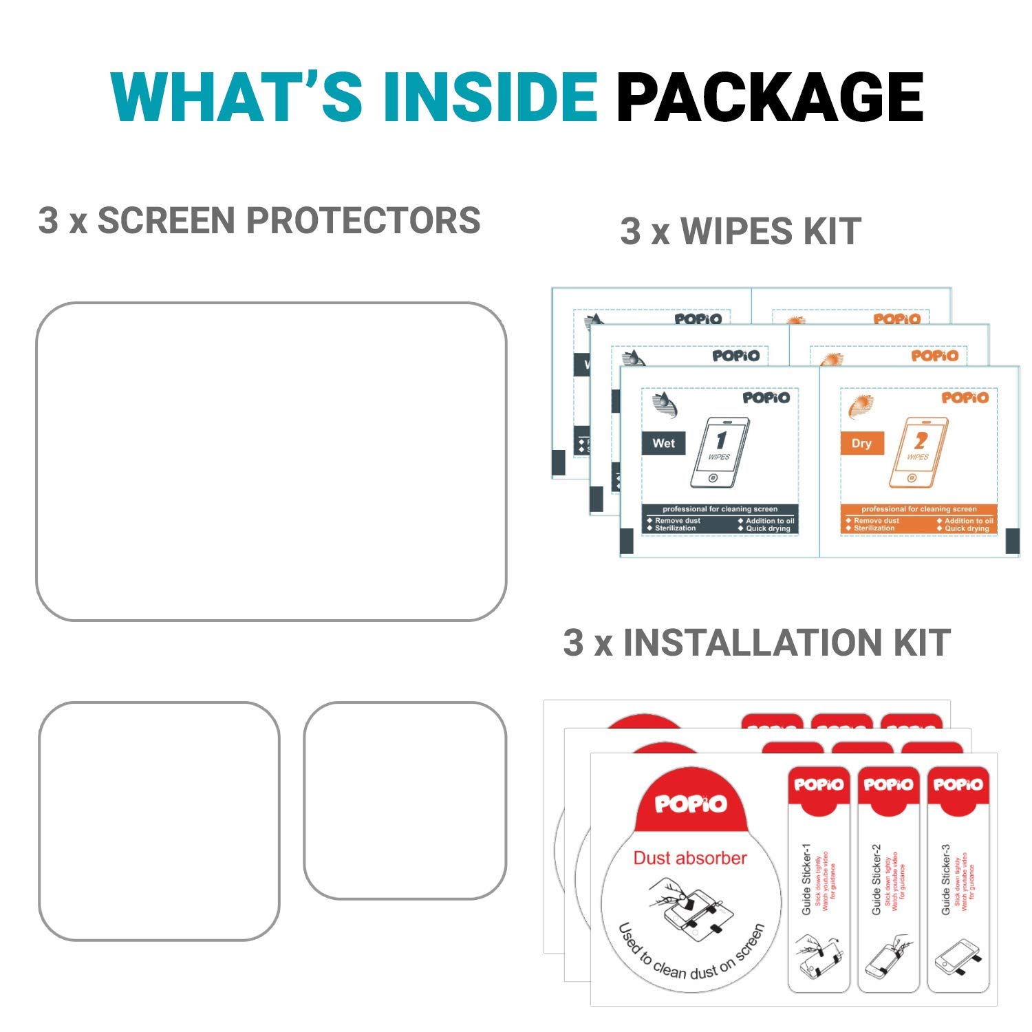 📷【Package Includes】 : 3 Tempered Glass , 3 Installation Kit , 3 Dry & 3 Wet Wipes