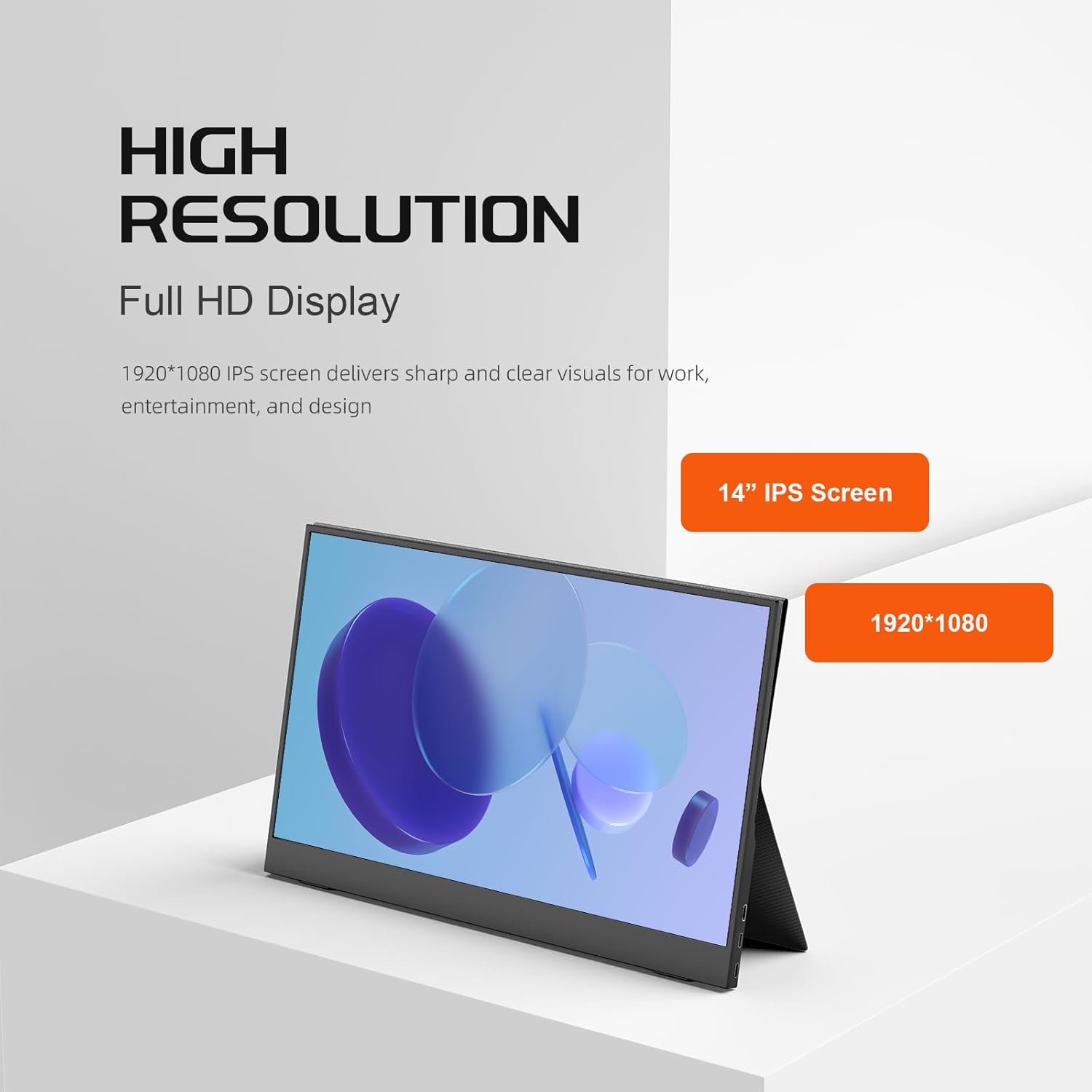 【Vibrant Visuals for All Tasks】This 14-inch small monitor delivers 1920×1080 resolution, 300 nits brightness, and 45% sRGB, making every detail pop. This portable monitor doubles your workspace. As a gaming monitor, it keeps visuals sharp; as a pc monitor, it eases multitasking. Light enough for dorms, offices, or cafes, it’s the versatile screen you need.