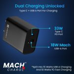 【PD 3.0 & MACH】: Equipped with a 33W Power Delivery,3.0 port, and an Mach USB A port, the charger allows for charging two devices simultaneously.