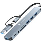 8-in-1 Dual USB Hub: Expand your device’s functionality with the Mport 8 Plus, featuring 8 essential ports including AUX audio jack, USB 3.0, USB 2.0, SD and microSD card readers, Type-C data, PD charging port, and both USB-A & Type-C input connectors—perfect for laptops, tablets, and smartphones.