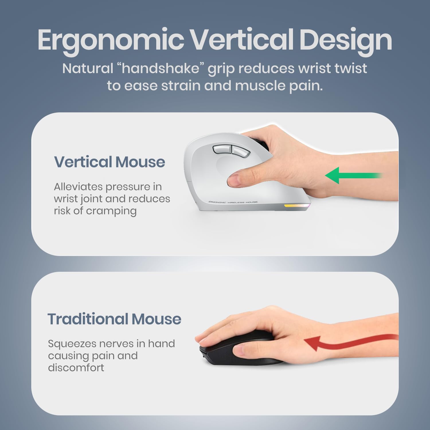 Ergonomic Vertical Mouse for Wrist Pain Relief – natural handshake grip reduces strain; right-hand design helps prevent fatigue/carpal tunnel during long office or WFH sessions.