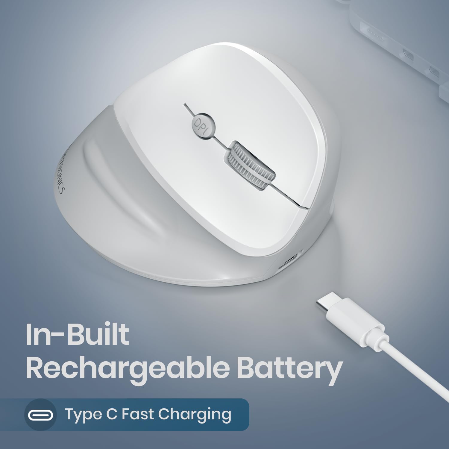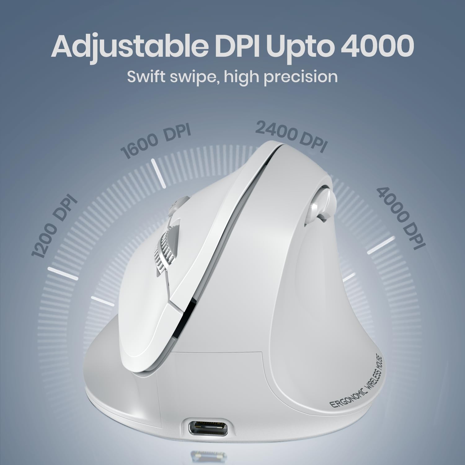 this ergonomic vertical mouse designed to reduce wrist strain and support a natural handshake grip—ideal for right-hand users, long office hours, and WFH setups. Enjoy dual-mode connectivity (Bluetooth + 2.4GHz USB dongle) and pair up to 2 devices at once, switching instantly between laptop, desktop, and tablet on Windows/Mac/Android. The rechargeable Type-C battery removes AA hassles, while the stable 10 m wireless range keeps your desk clutter-free. Fine-tune control with adjustable sensitivity up to 4000 DPI (800/1600/2400/4000) for spreadsheets, design, browsing, and casual gaming. Work faster with 6-button controls including DPI switch, forward/back navigation, and precise scroll. An advanced optical sensor and 2.4G tech deliver smooth, lag-free tracking on most surfaces. Perfect as a wrist pain relief mouse, Bluetooth vertical mouse, rechargeable wireless mouse, or office mouse for laptop & Mac.
