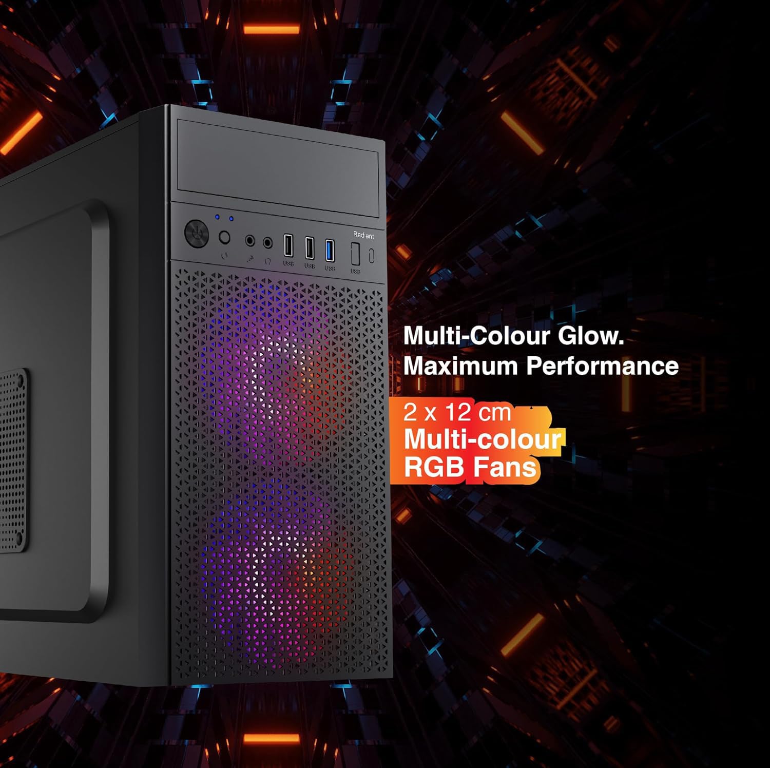 🌈 Stylish RGB Lighting & Cooling System Comes with two 12 cm multi-colour RGB cooling fans that keep the system cool during heavy use while adding a vibrant and modern aesthetic to your setup. Adjustable RGB lighting reduces eye strain and allows you to personalize your workspace, making it perfect for gamers, creators, and professionals who value both performance and style.