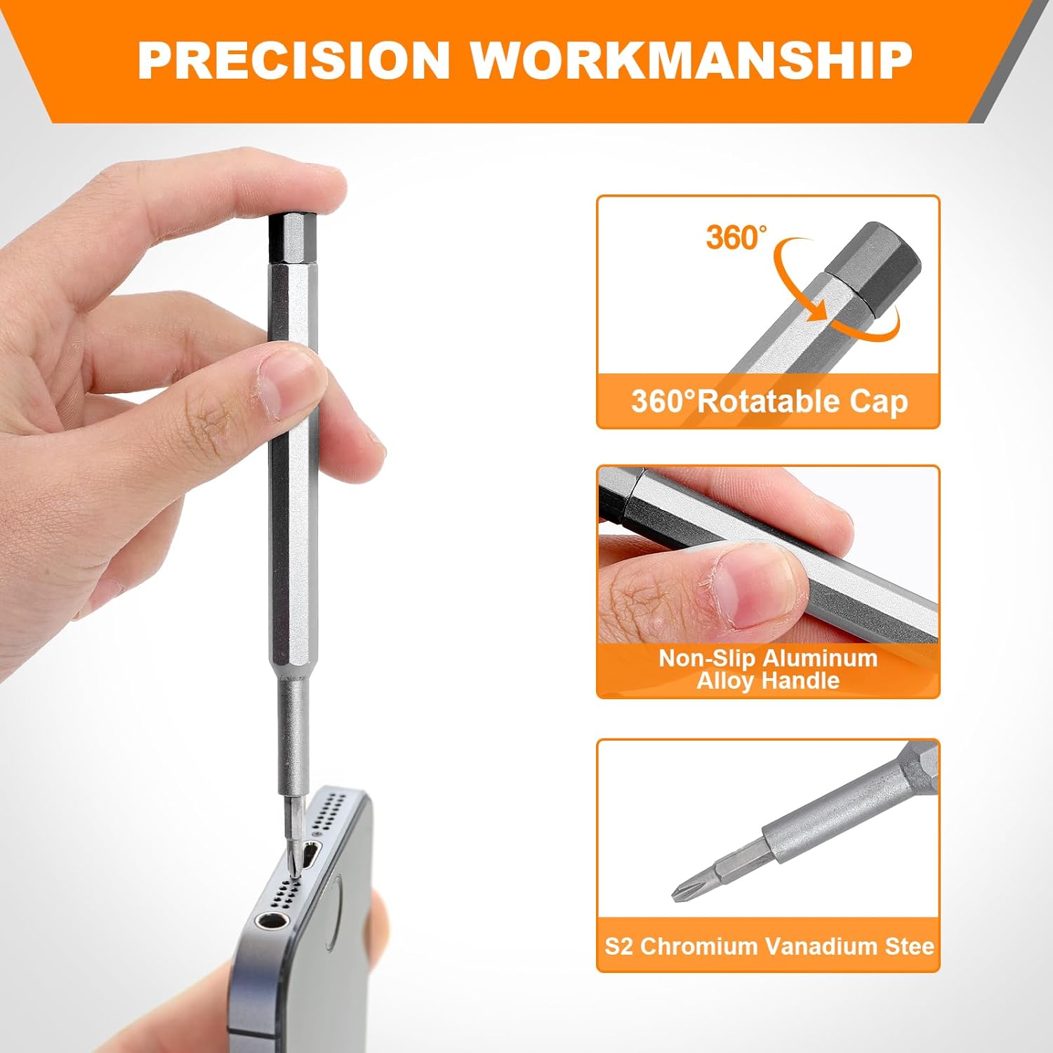 【High Quality & Durable】 Our small screwdriver set is made of premium S2 steel, the metal of the screwdriver bit is resistant to oxidation and rust, and is very durable, fit perfectly into screws protect both the tips and devices from damage.The alloy handle has a special anti-slip design. 360°rotating cap rotates smoothly, considerably enhancing work efficiency.